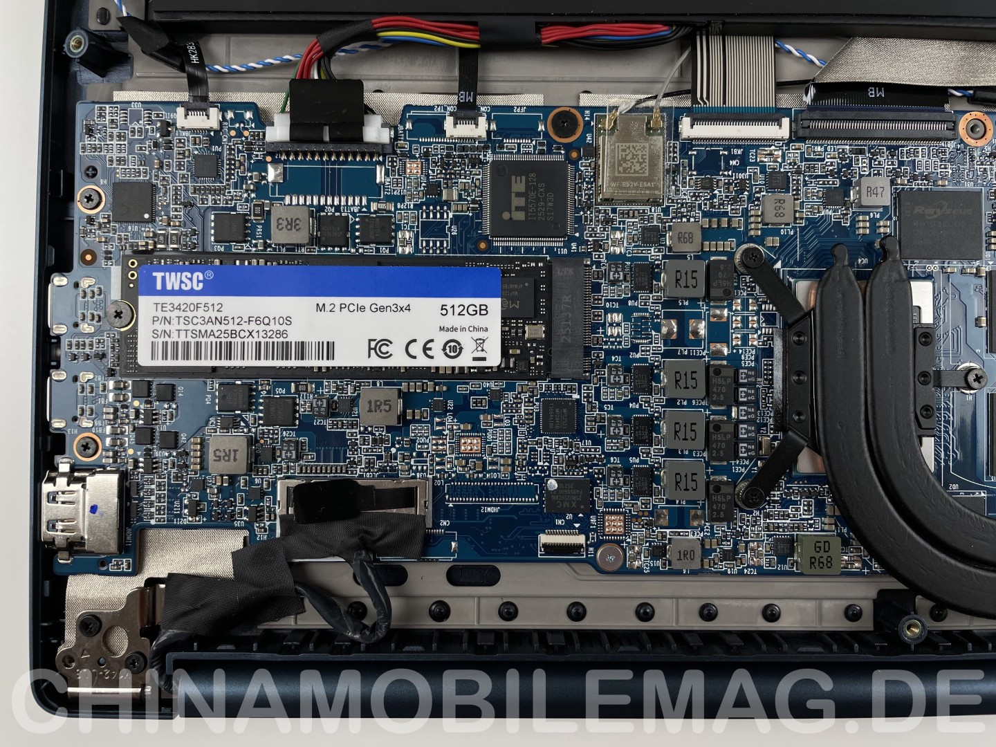 Bei der SSD verbaut Chuwi weiterhin nur eine 512GB SSD. Wer mehr Speicherplatz braucht, muss also aufrüsten, was dank M.2 2280 Slot problemlos möglich ist. Laut Chuwi kann in das CoreBook Air bis zu 1TB verbaut werden, wobei technisch nicht ersichtlich ist, warum nicht auch größere SSDs funktionieren sollten. Während ab Werk eine PCIe 3.0 SSD verbaut wird, kann auf Wunsch auch eine PCIe 4.0 SSD verbaut werden. Der Slot bietet entsprechende Unterstützung mit einer Anbindung von 4 Lanes.