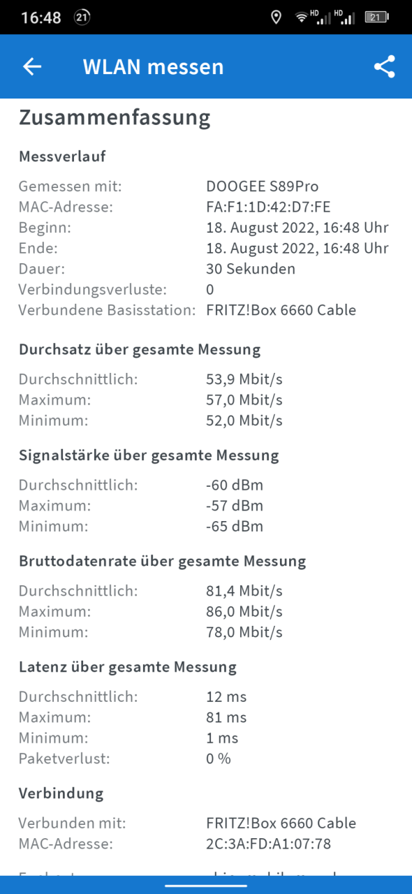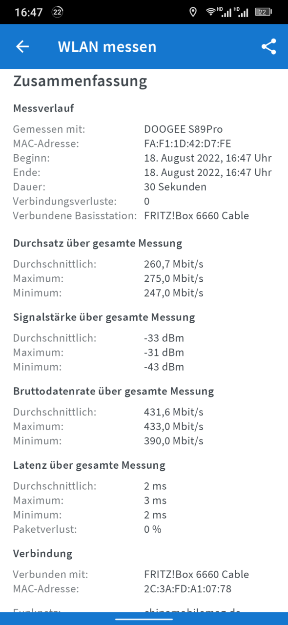WLAN wird mit maximal dem AC-Standard ohne MIMO unterstützt. Das resultiert in einer maximalen Brutto Bandbreite von 433Mbit/s, wovon Netto noch durchschnittlich 260Mbit/s am Smartphone ankommen, wenn man sich direkt neben dem Router befindet. Ein Stockwerk unter dem Router erfolgt ein Wechsel ins 2,4GHz Band. Hier werden im Schnitt solide 53,9Mbit/s erreicht, wobei die Datenrate sehr stabil bleibt.