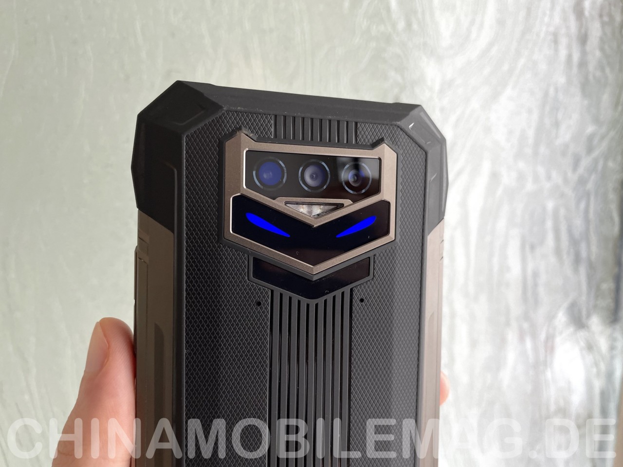 Beim Blick auf die Rückseite zeigt das Doogee S89 Pro dann eine sehr eigenständige Optik. Hier zeigt sich eine stilisierte Batman Silhouette, die vor allem dann zur Geltung kommt, wenn die RGB Beleuchtung aktiv ist. In dem großen schwarzen Streifen befindet sich nämlich eine RGB Beleuchtung in Form zweier Augen, die eine nette optische Spielerei ergeben und noch dazu einen praktischen Nutzen haben.