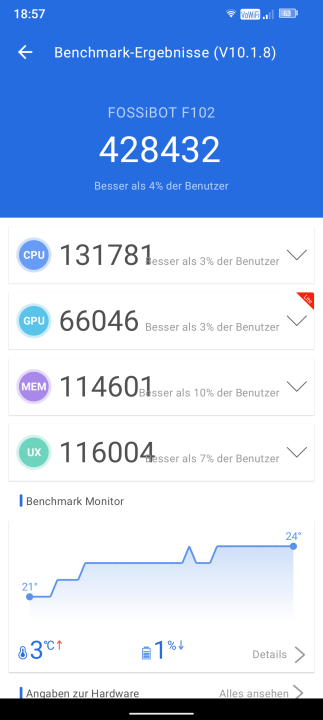 Das Fossibot F102 setzt auf den bewährten und nach wie vor äußerst beliebten Mediatek Helio G99 als Prozessor. Das SoC liefert bei guter Software Optimierung eine sehr gute Performance und kann 120Hz Displays im normalen Alltagsgebrauch problemlos bedienen. Das F102 zählt zu den Helio G99 Smartphones mit sehr guter Software Optimierung, was direkt durch die sehr flüssige Performance im gesamten System, aber auch in typischen Alltagsapps auffällt. Schnelle Wechsel zwischen verschiedenen Apps verlaufen flüssig, das Scrollen durch große Webseiten zeigt ebenfalls keine Performance Engpässe. Lange Social Media Feeds meistert das Smartphone problemlos. Das Fossibot F102 fühlt sich im Alltag entsprechend flink an. Probleme mit der Abwärme zeigen sich im CPU Throttle Test nicht. Das Gehäuse erwärmt sich bei normaler Alltagsnutzung gar nicht bis kaum. Spiele sind mit gemäßigten Ansprüchen gut spielbar. Shadowgun Legends und Call of Duty Mobile laufen auf mittleren Einstellungen zufriedenstellend. Für Genshin Impact reicht die Grafikleistung des Helio G99 allerdings nicht aus. Selbst auf niedrigen Einstellungen macht der Titel auf dem Fossibot F102 keinen Spaß.