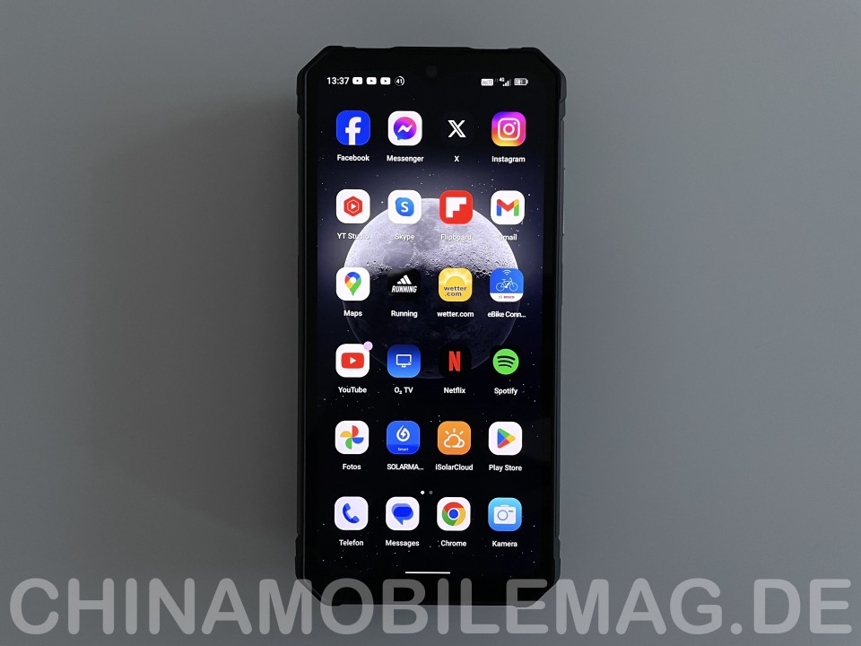 Im Fossibot F102 steckt ein LCD-basiertes Display mit der gängigen Diagonale von 6,58 Zoll. Das Panel setzt auf IPS Technik für stabile Blickwinkel und liefert eine Auflösung von 2408x1080 Pixel (FHD+) bei bis zu 120Hz Refresh Rate für eine flüssige Darstellung. Die Farbtiefe des Panels beträgt 8-Bit, sodass kein HDR unterstützt wird. Qualitativ macht das Display einen soliden Eindruck. Farblich muss es sich nicht verstecken und liefert auch einen guten Kontrast. Die Ausleuchtung fällt gleichmäßig aus und Schattenbildung ist bei unserem Testgerät nur sehr subtil in der unteren rechten Ecke auszumachen. Einzelne Pixel sind bei normalem Abstand nicht zu erkennen. Das Bild wirkt entsprechend scharf. Das Fossibot F102 erreicht laut Messung eine maximale Helligkeit von 450 Nits und liegt damit im gängigen Bereich der chinesischen Outdoor-Handys. Etwas mehr Helligkeit hätte wie so oft nicht geschadet, denn gerade bei intensiver Sonneneinstrahlung können manche Inhalte bei 450 Nits nur schwer zu erkennen sein.
