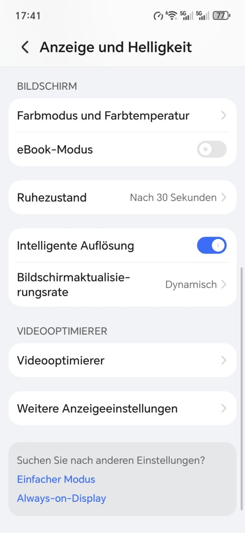 Bei den Displayeinstellungen liefert das Honor Magic 8 Pro Air weitgehend dieselben Einstellungen wie das große Magic 8 Pro. Zu den Standard Android Einstellungen wie Darkmode, Lesemodus und Nachtmodus gesellt sich ein recht umfassendes Farbmanagement, das neben Presets und Farbtemperatur auch erweiterte Einstellungen für die manuelle Kalibrierung des Displays bietet. Neben RGB-Werten lassen sich hier Farbton, Sättigung, Kontrast, Schärfe und Helligkeit einstellen. Eine Gamma-Anpassung fehlt allerdings. Die Videooptimierung zur Verbesserung der HDR Inhalten und Upscaling von Videos in geringer Auflösung ist ebenfalls vorhanden.