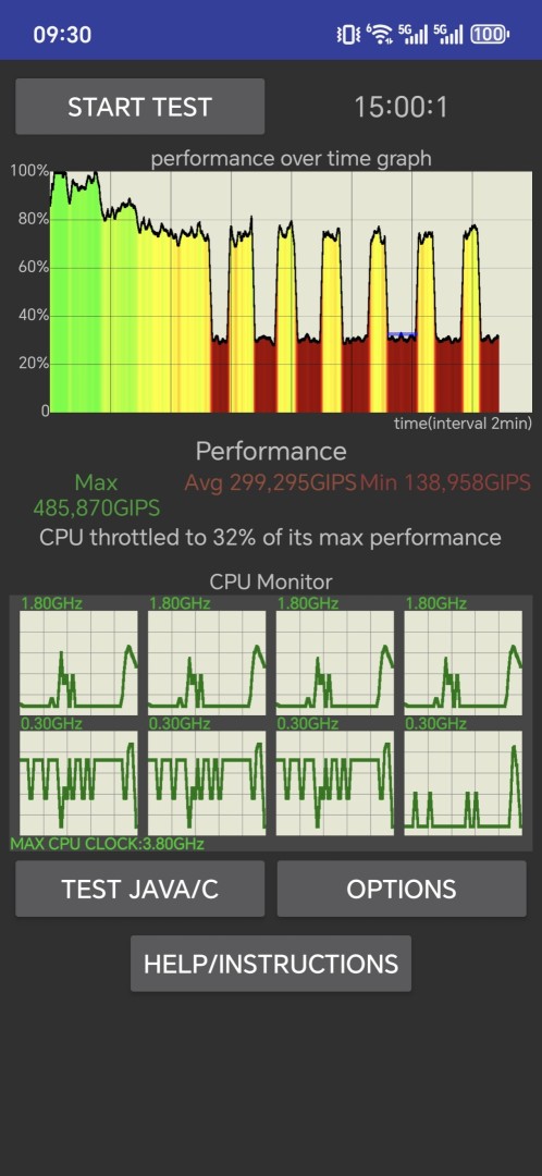 Dass das Honor Magic 8 Pro Air ein deutlich unterdimensioniertes Kühlsystem besitzt, zeigt sich nicht nur beim Spielen, sondern ganz klar auch in entsprechenden Drossel-Tests. Wie ihr unten an den Screenshots sehen könnt, ist der Leistungseinbruch beim CPU Throttling-Test nicht nur sehr ausgeprägt, sondern tritt auch deutlich schneller ein als bei anderen Flaggschiffen. Der GPU Throttle Test konnte noch nichtmal beendet werden, da die App vorher vom System beendet wurde und anschließend mit einer entsprechenden Fehlermeldung bezüglich der Überhitzung des Geräts quittiert wurde. Gleiches passiert auch beim Ausführen normaler Benchmarks wie Antutu im Leistungsmodus. Die Empfehlung ist also, diesen deaktiviert zu lassen und das Honor Magic 8 Pro Air nur im Ausbalanciert-Modus zu nutzen.