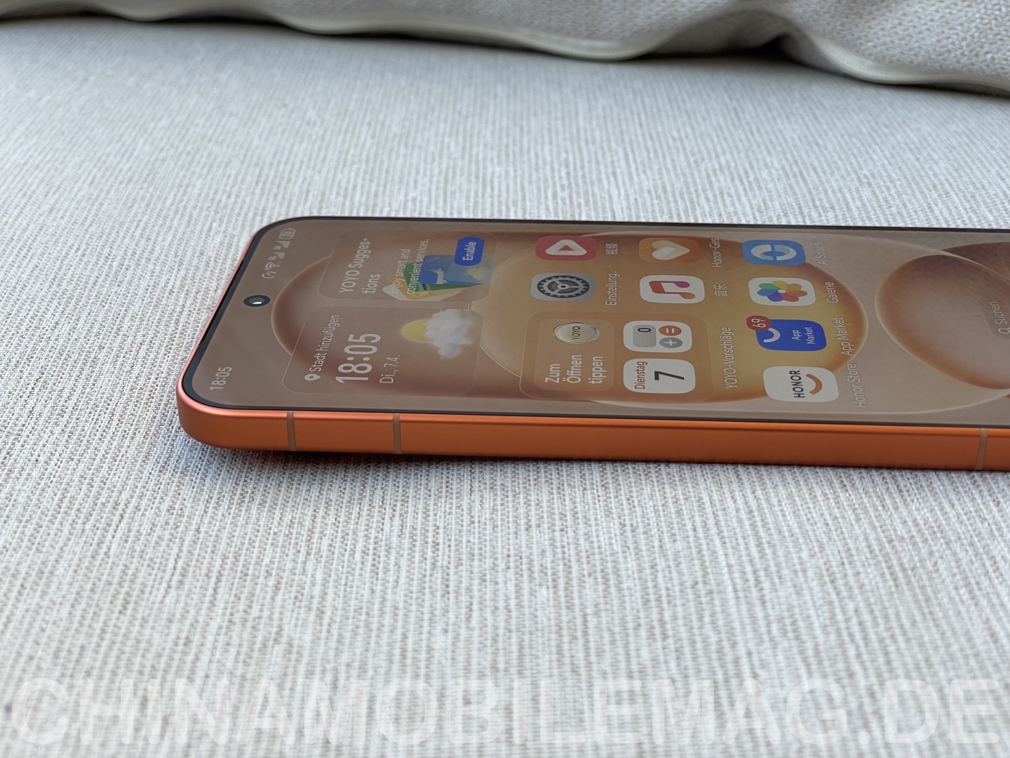 Das Honor Magic 8 Pro Air setzt wie sein großer Bruder und auch die Konkurrenz im ultraschlanken Smartphone-Segment auf einen Metallrahmen zur Stabilisierung des schlanken Designs, welcher in flacher Ausführung daher kommt und mit einem matten Finish versehen ist. Farblich ist dieser passend zur gewählten Gerätefarbe abgestimmt - bei unserem Testgerät also in einem leuchtenden Orange. Die Rückseite besteht hingegen aus mattem Kunststoff, was ja im Oberklasse Segment mittlerweile häufiger vorkommt und von vielen Nutzern begrüßt wird, da hier de Bruchgefahr geringer ausfällt.