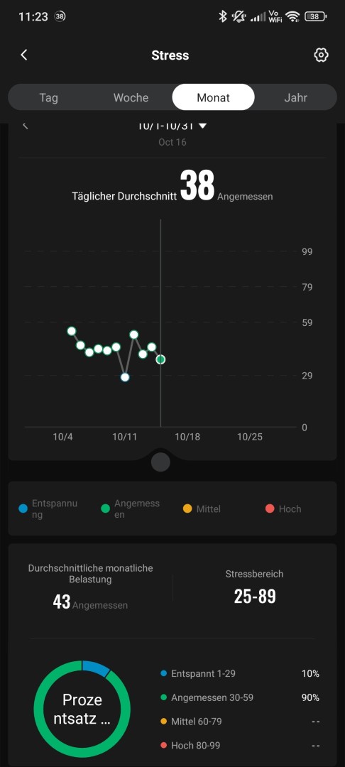 Das Stresslevel kann die Uhr ebenfalls überwachen. Dieses wird als Wert zwischen 1 und 99 angezeigt, wobei 1 bis 29 als entspannt, 30 bis 59 als normal, 60 bis 79 als mäßig und 80 bis 99 als hoch eingestuft werden. Auf der Uhr gibt es dazu eine Tagesübersicht als Balkendiagramm und eine Aufschlüsselung nach Kategorie mit dem jeweiligen Prozentsatz. Gleiches gilt auch für die Mibro Fit App.
