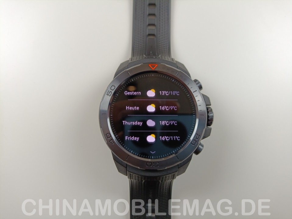 Recht umfangreich fällt dann noch die Wetter-App aus. Diese zeigt, sofern die Uhr mit dem Handy verbunden ist, die Wetterwerte vom aktuellen Standort an. Auf der Startseite sieht man das aktuelle Wetter mit aktueller sowie minimaler und maximaler Temperatur. Zudem werden Informationen zur Luftqualität und dem UV-Index angezeigt. Ganz unten steht auch noch, wann die Werte zuletzt aktualisiert wurden.