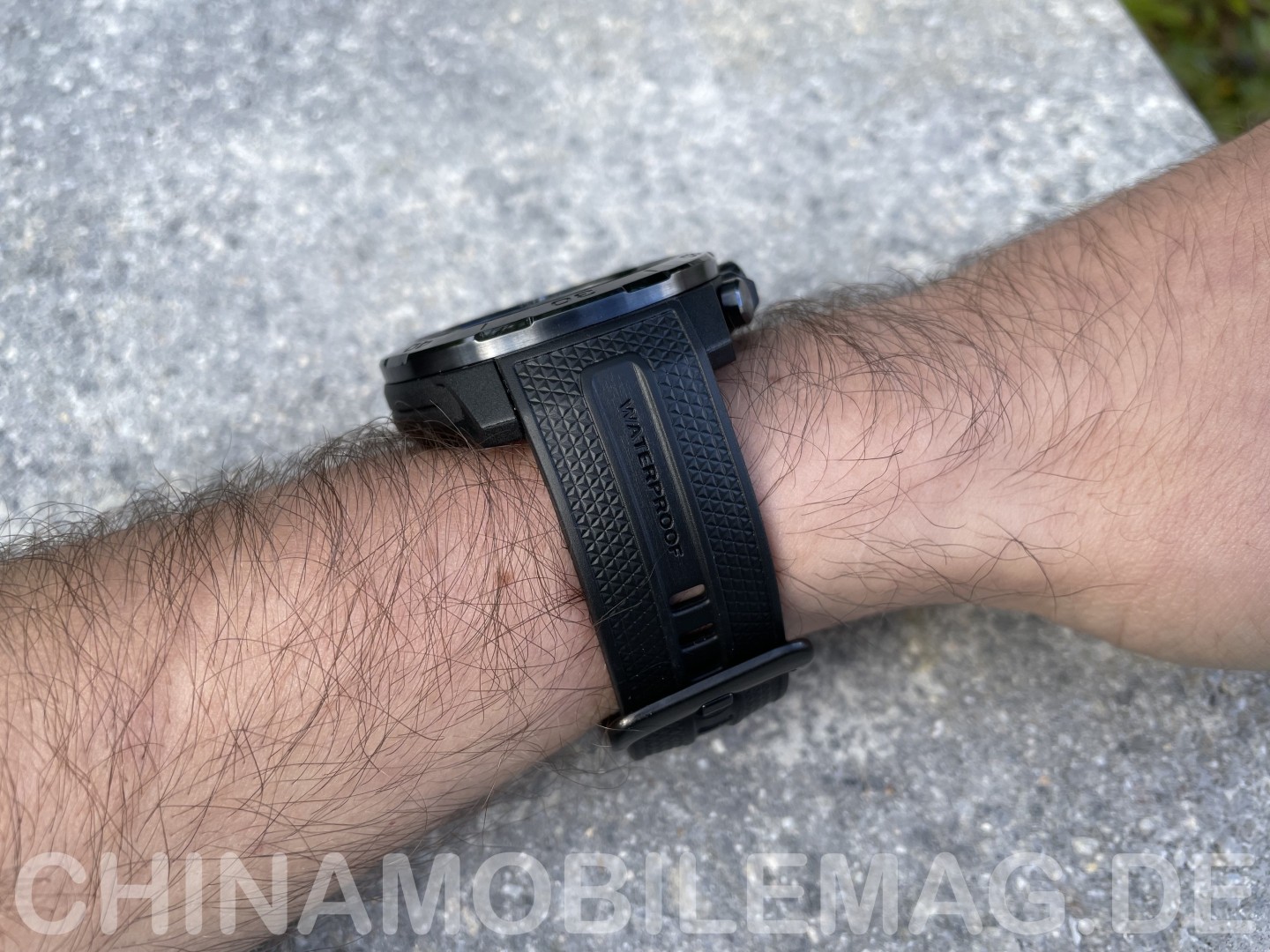 Das werksseitig montierte Gummiarmband mit Dornschließe sitz sehr bequem und bietet viele mit geringem Abstand platzierte Löcher, sodass es an jeden Arm passen sollte. Es gibt zwei Ösen zur Fixierung des Bandes, die jeweils in die Löcher greifen und somit nicht zum Verrutschen neigen. Angenehm ist, dass man das Band nicht zu fest anbringen muss, um die Uhr am Verrutschen zu hindern. Das erhöht den Tragekomfort enorm.