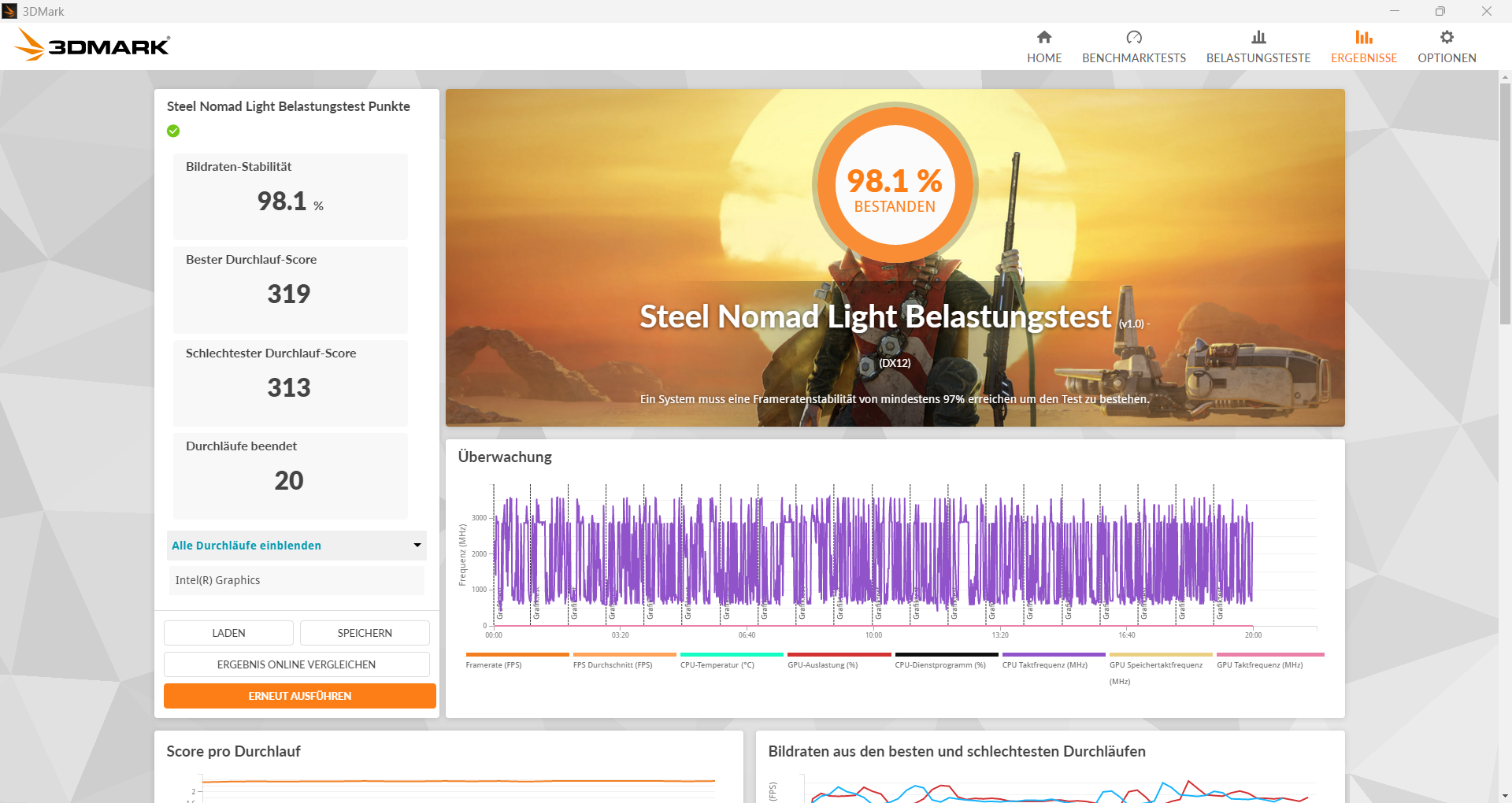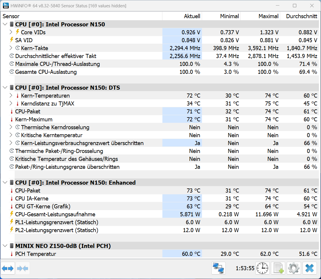 Ein Volllast-Test mit Prime95 und FurMark über knapp zwei Stunden zeigte keine Hitzeprobleme. Das CPU Package erreichte im Durchschnitt 60 Grad, abermals ohne Thermal Throttling. Das 6W Long Duration Power Limit erscheint hier tatsächlich zu konservativ gewählt. Minix hätte hier durchaus einen höheren Wert ansetzen können, um mehr Leistung zu ermöglichen. Der Throttle Test mit 3DMark Steel Nomad Light Stress Test bestätigt dies und zeigt ebenfalls keine Engpässe bei der Kühlung. Die Stabilität von 98,1% liegt im Bereich der Fehlerspanne. Einfach ausgedrückt: es ist kein Leistungsverlust feststellbar.