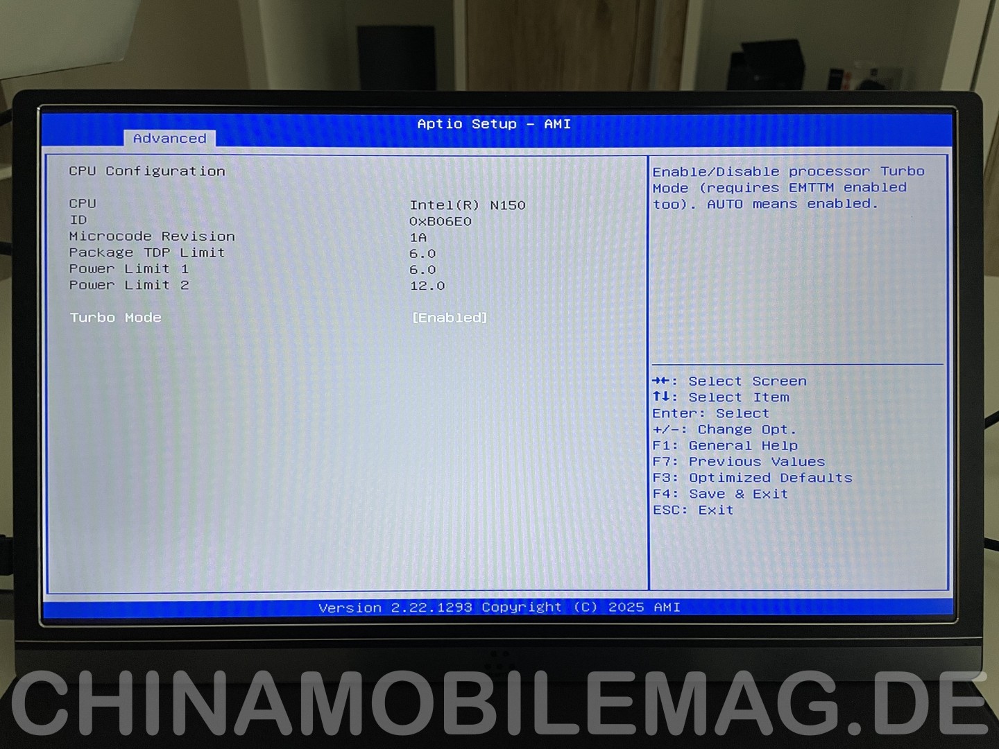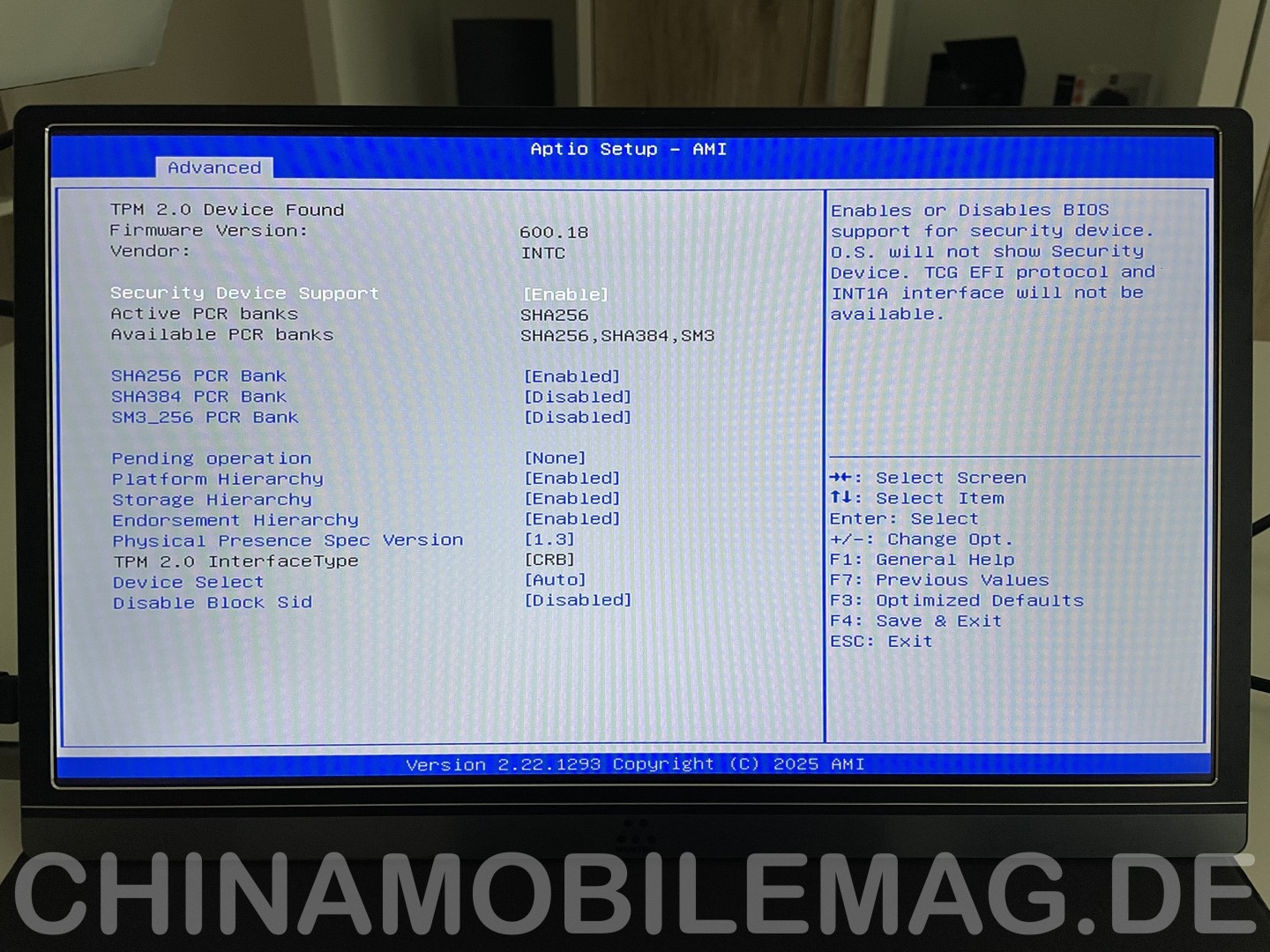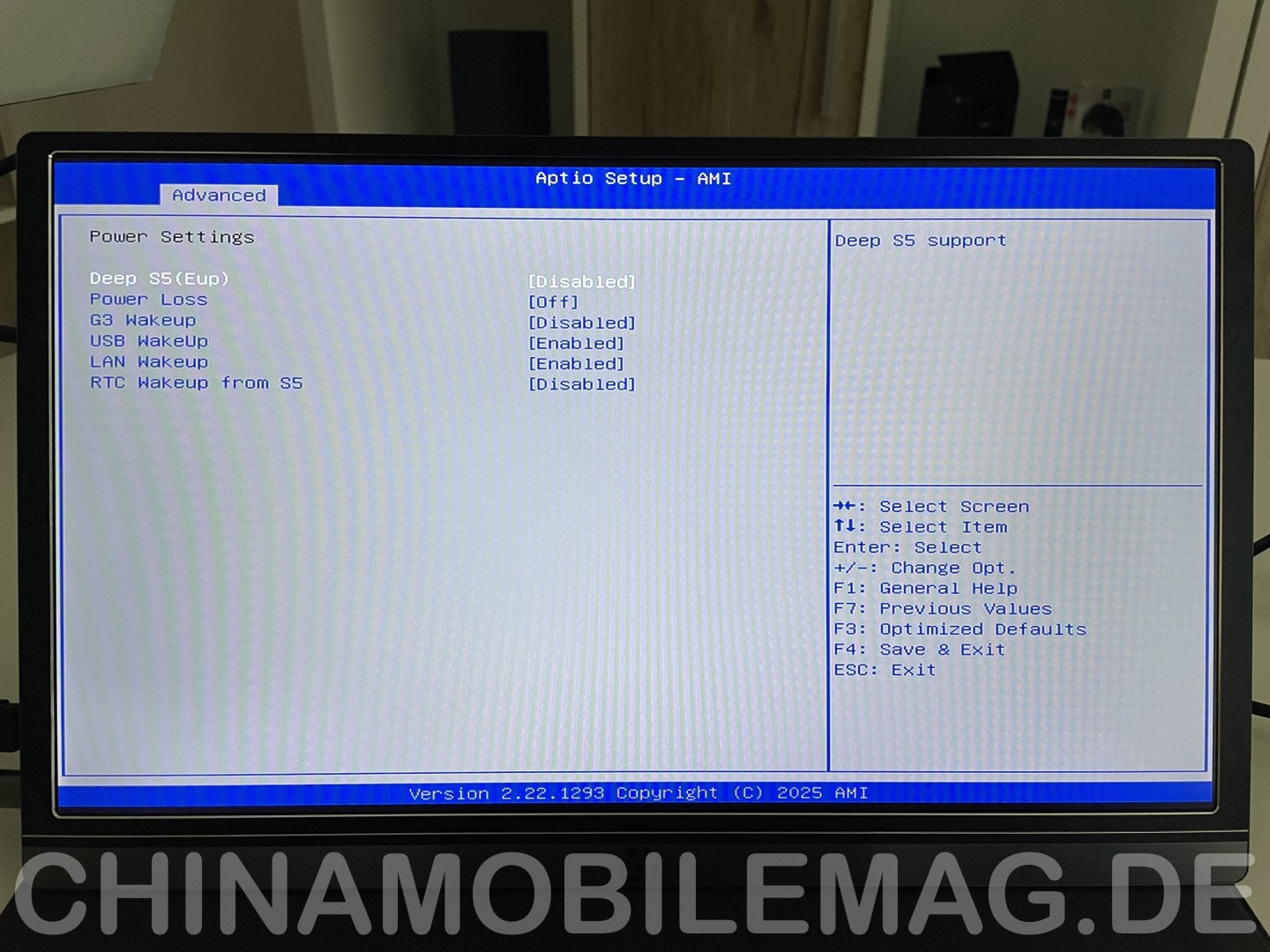 Das BIOS bzw. UEFI nutzt AMI Aptio Firmware. Das Menü ist gesperrt, erweiterte Optionen wie Power Limits sind daher nicht zugänglich. Die wichtigsten Optionen sind aber vorhanden. TPM ist verfügbar mitsamt den entsprechenden Einstellungen. Secure Boot lässt sich deaktivieren. Für den Einsatz als Server stehen die relevanten Optionen bereit: Verhalten nach Stromverlust, RTC Wake und Wake on LAN. Auch Einstellungen dafür, ob der Mini PC ohne angeschlossenen Monitor direkt startet oder Neustartversuche unternimmt, sind vorhanden.