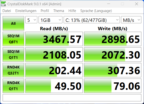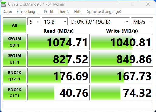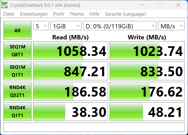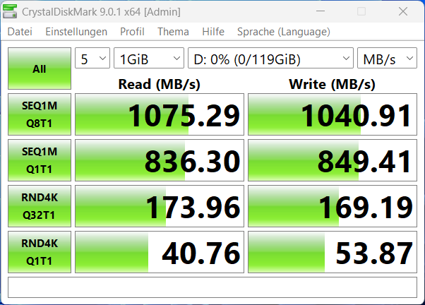 Der Test der USB-Ports liefert die versprochenen Geschwindigkeiten. Durchgeführt wurde der Test mit einer PCIe 4.0 SSD in einem USB 4 Gehäuse mit Abwärtskompatibilität. Beide USB-A Ports auf der linken Seite erreichen die beworbene Geschwindigkeit von 10Gbit/s. Gleiches gilt für den USB-C Port. Zu beachten ist, dass der USB-C Port ein reiner Datenport ohne Videoausgabe oder Power Delivery ist. Die Stromversorgung der SSD war problemlos. Auch eine 2,5" Festplatte in einem USB-Gehäuse wird von allen Anschlüssen ohne Probleme betrieben.
