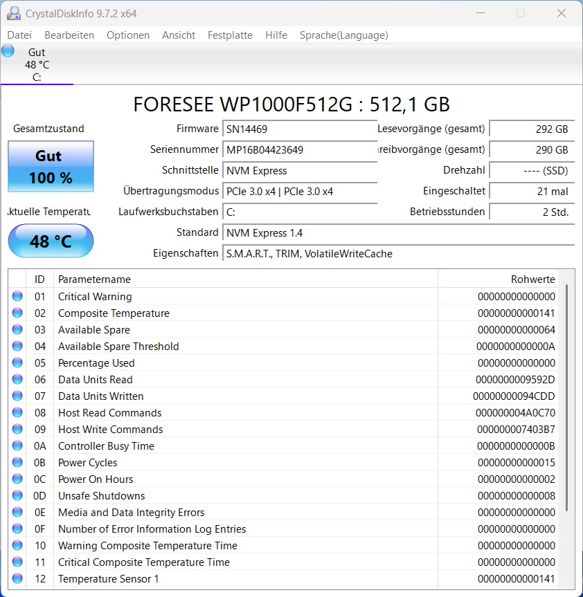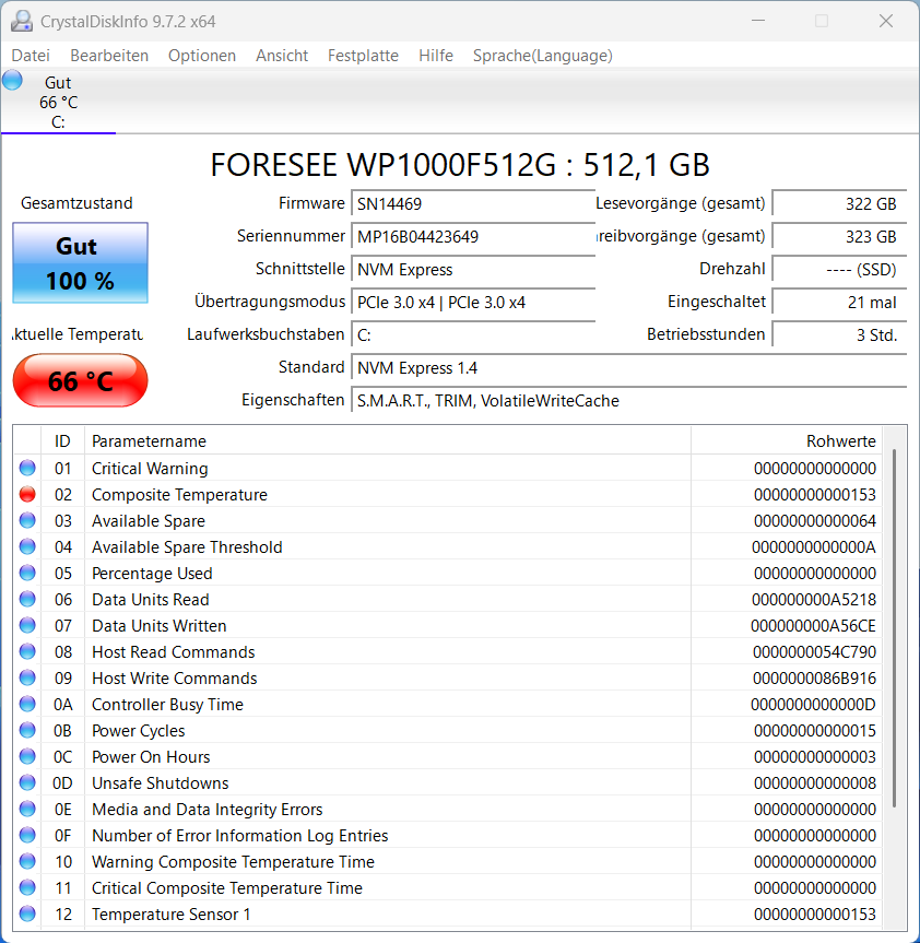 | Speicher | Slot: 1x M.2 2280 PCIe 3.0 x4 NVMe Ab Werk: 256GB oder 512GB PCIe 3.0 M.2 2280 NVMe SSD im Testgerät: 512GB Foresee WP1000F512G PCIe 3.0 |
