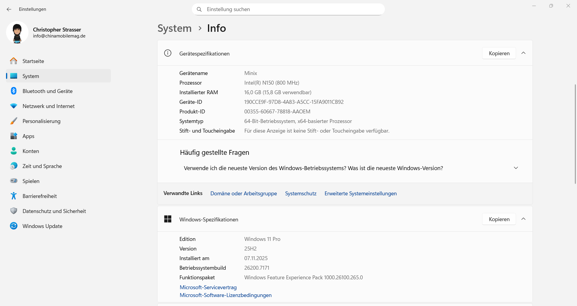 Der Minix Z150-0dB wird mit Windows 11 Pro ausgeliefert. Die Installation ist sauber und ohne Bloatware vom Hersteller. Auch die typische Windows 11 Bloatware wurde ausgedünnt. Die deutsche Sprache lässt sich ab Werk auswählen. Der Microsoft Account Zwang wird hingegen forciert. Windows Updates verliefen im Test problemlos. Die Lizenz ist vorhanden und im UEFI hinterlegt. Scans nach Schadsoftware verliefen ohne Funde.