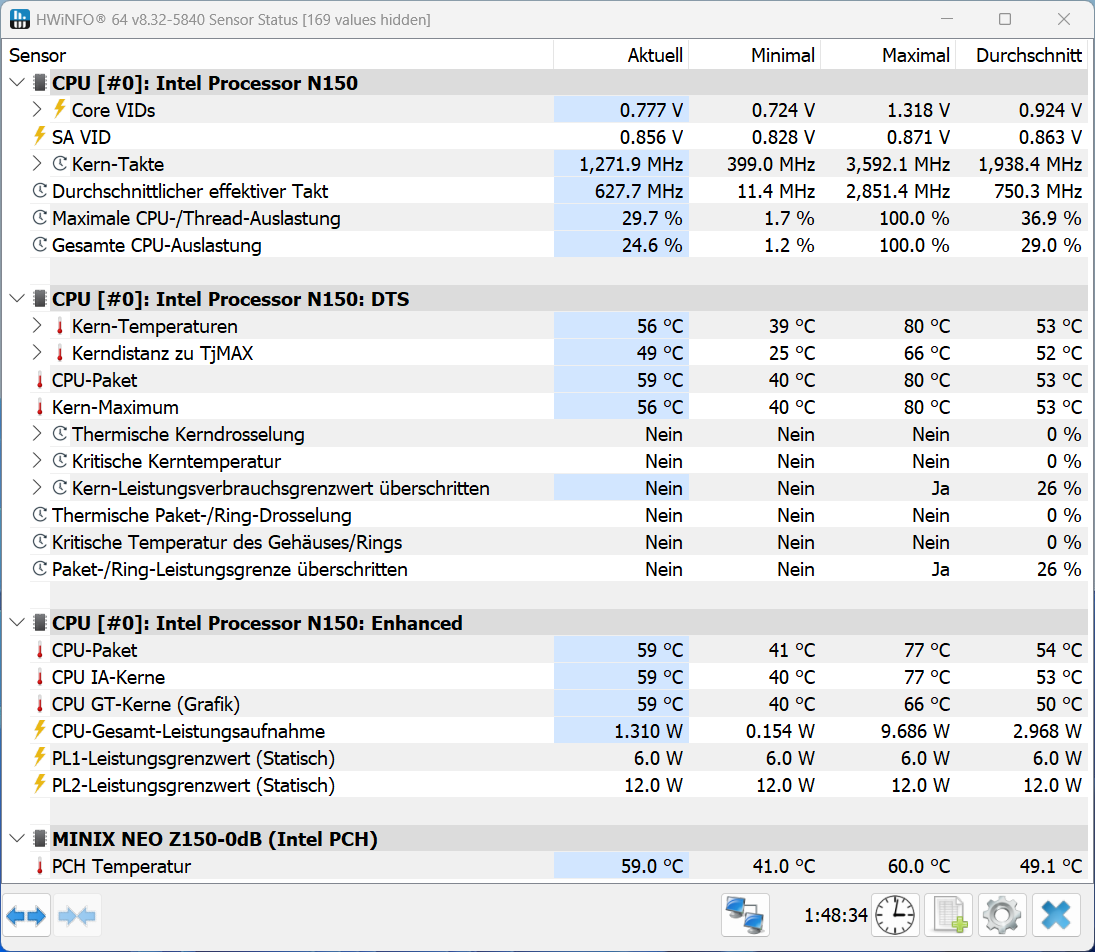 Die größte Stärke des Z150-0dB liegt in seiner Lautlosigkeit. Die passive Kühlung arbeitet zuverlässig und ohne Thermal Throttling, auch wenn sich das Gehäuse unter Last deutlich erwärmt. Der Intel N150 bietet im Vergleich zum N100 spürbar flüssigere Performance im Windows Alltag, vor allem beim Betrieb an 4k Displays. Für Office Arbeiten, Surfen, Streaming oder als Heimserver ohne größeren Leistungsbedarf ist die Leistung ausreichend. Der niedrige Stromverbrauch von rund 7 Watt im Idle, etwa 14 Watt beim Streaming und 20 Watt unter anhaltender Volllast ist ein weiterer Pluspunkt.