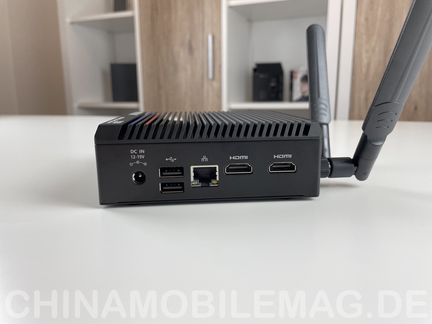 Die Anschlussausstattung fällt mit mehreren 10Gbit/s USB-Ports, zwei HDMI Ausgängen mit 4k60-Fähigkeit sowie 2,5Gbit Ethernet großzügig aus. Die externen WLAN Antennen sorgen für exzellente Reichweite. Positiv ist auch der wartungsfreundliche Aufbau mit einfachem Zugang zu RAM, SSD und WLAN Karte, wobei auch im Innenraum genügend Platz für RAM Riegel und SSDs mit großen Kühlkörpern vorhanden ist.