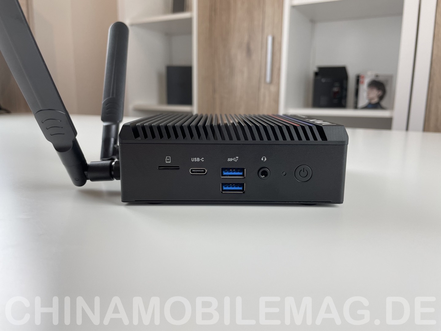 Die Anschlüsse verteilen sich auf die linke und rechte Seite des Gehäuses. Links finden sich ein MicroSD Kartenleser, ein USB-C Port, zwei USB-A Anschlüsse und ein 3,5mm Klinkenanschluss für Audio Ein- und Ausgang. Hier befinden sich auch die Power LED, die im Standby grün und im Betrieb blau leuchtet, sowie die Power-Taste. Auf der rechten Seite sind zwei HDMI 2.1 Ports in Vollgröße, ein 2,5Gbit Ethernet Anschluss, zwei weitere USB-A Ports und der DC-In Anschluss mit Hohlklinke untergebracht. An der Rückseite befinden sich zwei RP-SMA Anschlüsse für die WLAN Antennen.