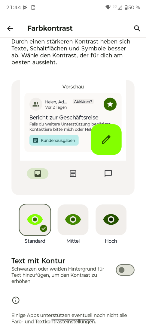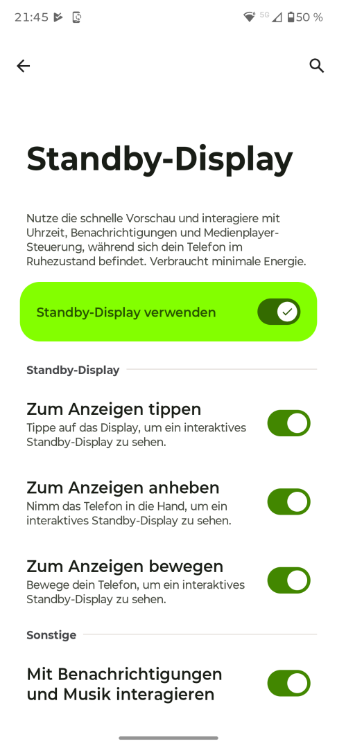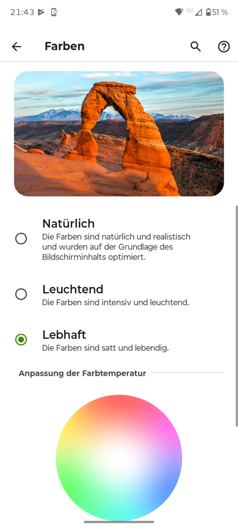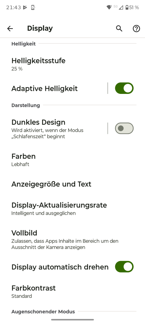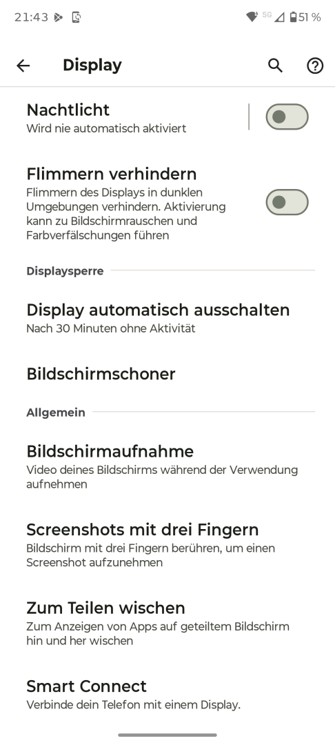 Die Display Einstellungen des Motorola Edge 70 entsprechen den Android Standards. Vorhanden sind Helligkeitseinstellung mit Automatik oder manueller Steuerung, Dunkelmodus manuell oder per Zeitplan, Skalierung und Textgröße, Farbkontrast sowie Nachtlicht. Zusätzlich gibt es ein Farbmanagement mit manueller Weißwert-Anpassung und drei Presets, allerdings keine erweiterten Optionen. Die Bildschirm Refresh Rate lässt sich auf Automatik oder feste 120 oder 60Hz einstellen. Optional steht eine Flimmer-Reduktion mit DC-Dimming für niedrigere Helligkeitsstufen zur Verfügung. Ein Always-On Display ist nicht vorhanden. Das Standby-Display lässt sich nur mit Timeout nutzen. Die Aktivierung erfolgt bei Bewegung, Berührung oder Anheben. Die einzelnen Trigger lassen sich bei Bedarf abschalten.