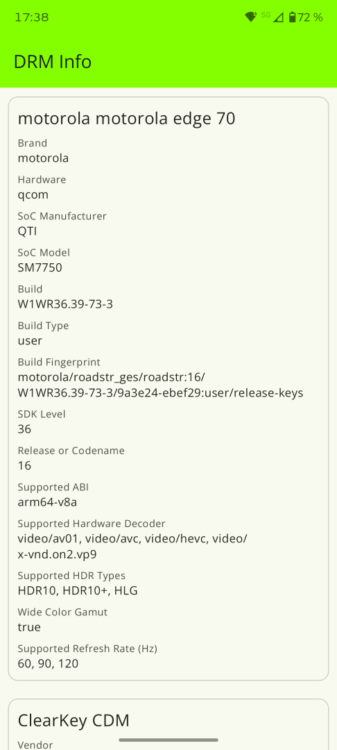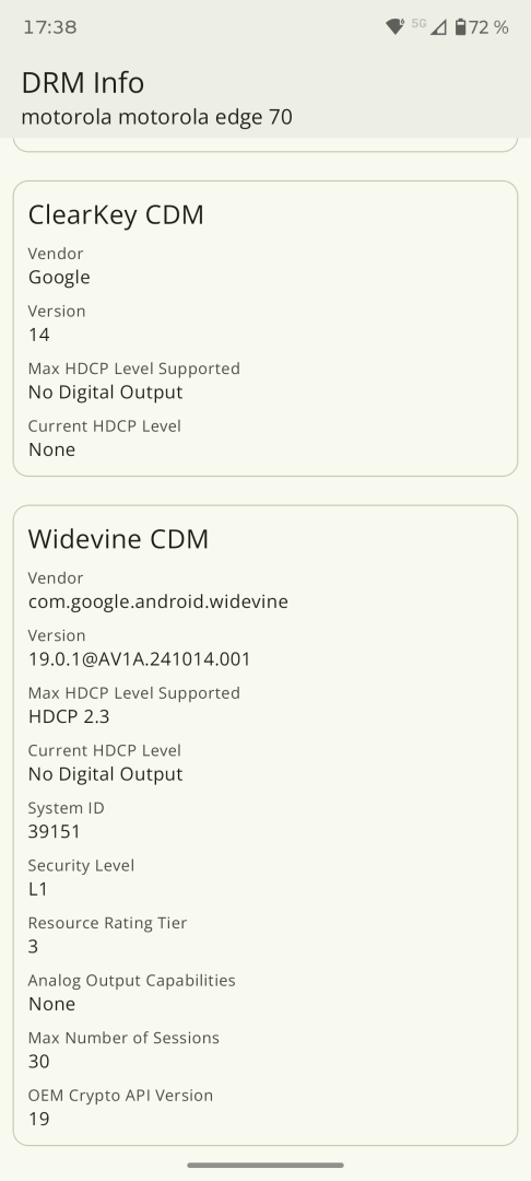 Das Motorola Edge 70 verfügt über die Google Zertifizierung und unterstützt alle Google Dienste ohne Probleme. Banking-Apps und andere Drittanbieter-Apps, die eine Zertifizierung erfordern, funktionieren ohne Probleme. Widevine Level 1 DRM wird unterstützt, sodass hochauflösendes Streaming in Diensten wie Netflix oder Amazon Prime Video möglich ist. HDR-Unterstützung ist wie schon erwähnt mit maximal HDR10+ verfügbar, Dolby Vision wird nicht unterstützt.