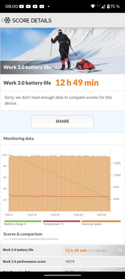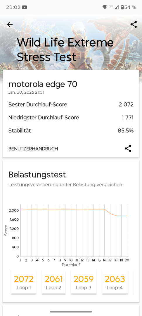 Immerhin bleibt das Motorola Edge 70 erfreulich kühl. Es wird trotz der schlanken Bauweise nur warm, aber niemals richtig heiß. Auch Thermal Throttling bei CPU und GPU ist nur geringfügig ausgeprägt. An dieser Stelle gibt es also nichts zu kritisieren und hier zeigt sich ein klarer Vorteil des vergleichsweise schwachen Prozessors.
