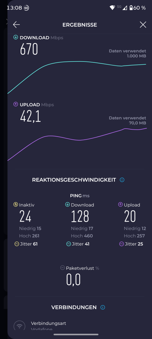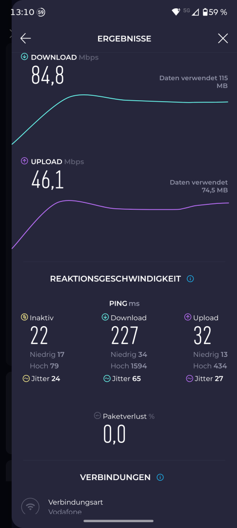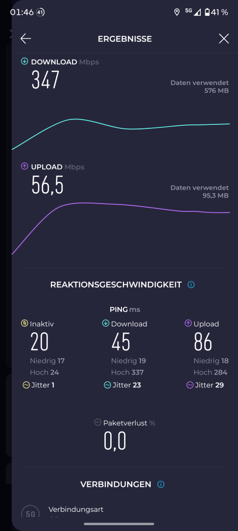 Der Mobilfunkempfang wird durch die schlanke Bauweise nicht beeinträchtigt. Im Alltag war er stets sehr gut. In schlecht abgedeckten Gegenden oder Räumen mit geringer Signalstärke traten keine kompletten Aussetzer auf. Auch die Performance zeigt sich sehr gut. Im 5G Speed Test nachts bei freiem Netz wurden 347Mbit/s im Download und 56Mbit/s im Upload erreicht.