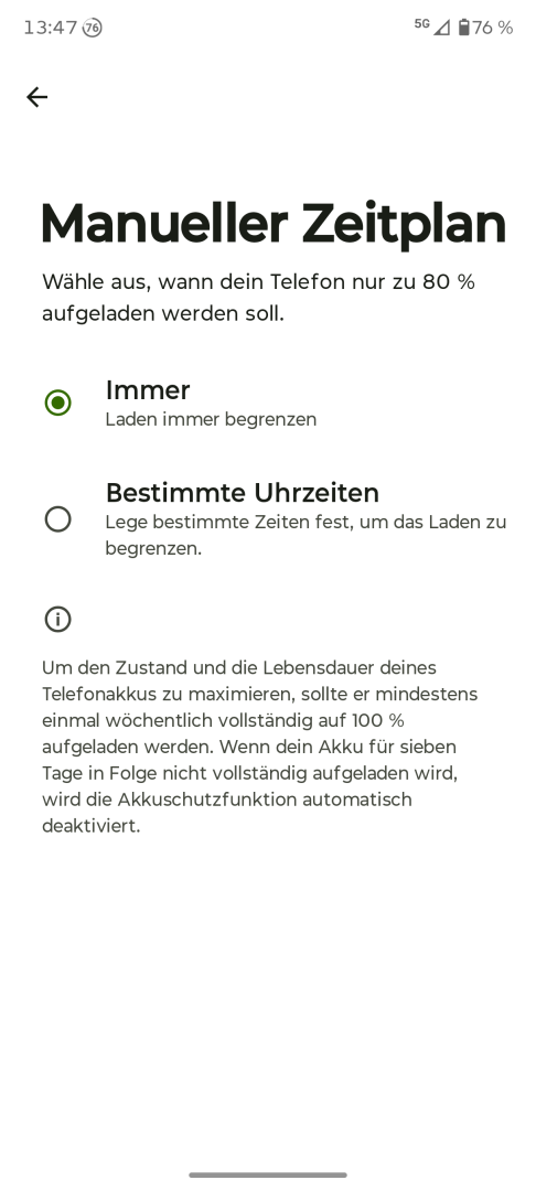 Ein Netzteil ist nicht im Lieferumfang enthalten. Angesichts der überzogenen UVP ist das eine Frechheit. Teilweise gab oder gibt es das Netzteil immerhin als Geschenk dazu. Unterstützt wird maximal 68W Ladeleistung über Turbo Power. Die meisten USB-PD Netzteile laden das Gerät langsamer, insofern verzichten wir an dieser Stelle auf Aussagen zur Ladegeschwindigkeit. Wireless Charging wird mit dem Qi Standard bis 15W unterstützt. Akkuschutzoptionen sind vorhanden: Ladelimit auf 80% basierend auf KI oder manueller Planung sowie auf Wunsch begrenzte Ladegeschwindigkeit durch Deaktivierung der Ladeboost Option.