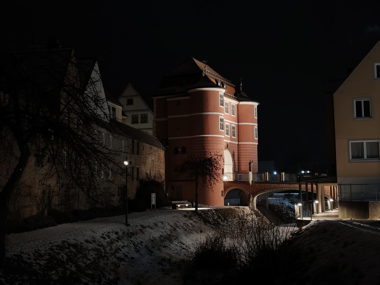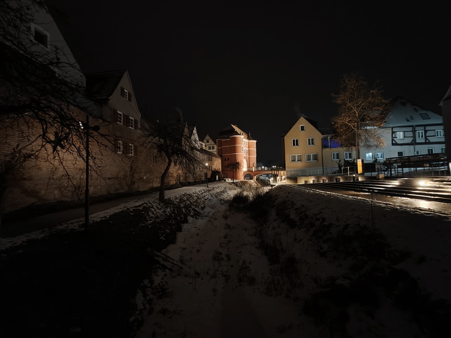 Bei Nachtfotos kann das Oppo Find X9 Pro überraschenderweise auch mit dem Vivo mithalten, trotz älterem und etwas kleinerem Sensor. Die größere Blende gleicht den Nachteil offenbar vollständig aus. Tatsächlich sind hier kaum Unterschiede zwischen den Modellen zu sehen. Auch das Oppo liefert rauscharme, scharfe und detaillierte Nachtfotos mit hoher Lichtausbeute. Motive mit wenig Kunstlichtquellen fallen qualitativ auch noch gut und erstaunlich hell aus. Nur beim Reinzoomen in die Aufnahmen zeigen sich eventuell etwas matschigere Details oder mehr künstliches Nachschärfen als beim Vivo, aber das lässt sich schwer sagen, da das Vivo im Test mit starkem Nebel zu kämpfen hatte. Ein direkter erneuter Vergleich war leider nicht möglich, da das Testgerät vom Vivo wieder zum Shop zurück musste.