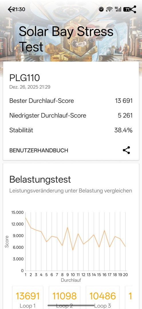Das GPU Throttling hingegen fällt beim Oppo Find X9 Pro stärker ausgeprägt aus als beim Vivo X300 Pro. Im Solar Bay Stress Test startet das Oppo bereits mit einem niedrigeren Wert von 13691 Punkten (Vivo: 14229 Punkte). Nach 20 Durchläufen liegt das Oppo bei 5261 Punkten, was eine Reduktion auf 38,4 Prozent der Ursprungsleistung bedeutet. Zum Vergleich das Vivo: Der Endwert liegt hier nach 20 Durchläufen bei 6974 Punkten, also noch 49 Prozent der ursprünglichen Leistung. Das Oppo Find X9 Pro bietet somit weniger Ausgangsleistung und zusätzlich stärkeres Thermal Throttling bei GPU Last.