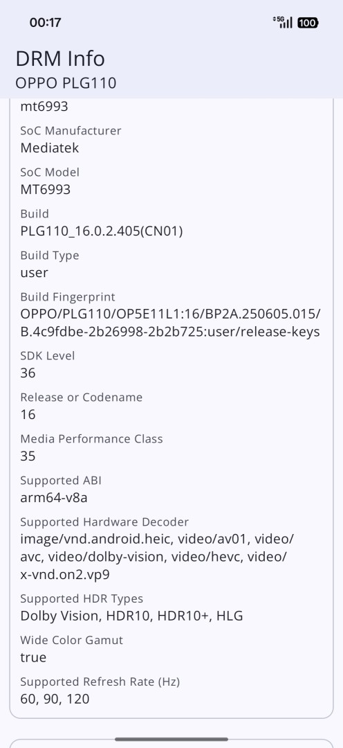 | Variante | ColorOS 16.0.2 Version im Test: PLG110_16.0.2.405(CN01) |