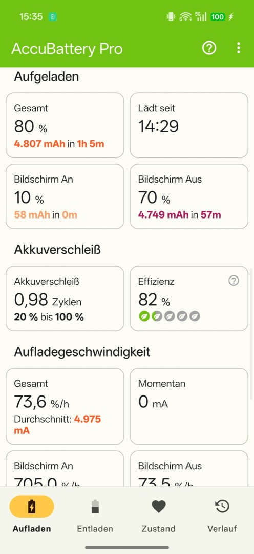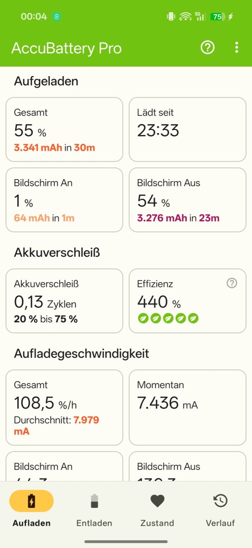 Die AccuBattery Statistik basierend auf Alltagsgebrauch gibt rund 23 Stunden erreichbare Screen-On Zeit (Dauerbetrieb), fast 5 Tage Standby (mit AOD) und fast 44 Stunden kombinierten Gebrauch an. In der Praxis entspricht das in der Regel 3 Tage Nutzung ohne Nachladen bei durchschnittlichem Gebrauch ohne lastintensive Anwendungen (kaum Spiele, gelegentliche Kameranutzung) und Herunterfahren über Nacht. Wer viel spielt und sehr häufig beziehungsweise für längere Zeit die Kamera nutzt und viel Videos über mobile Daten streamt, kann von zwei Tagen Laufzeit ausgehen, jeweils bis in die Nacht. Verglichen mit dem Vorgänger zeigt sich nochmal ein deutlicher Fortschritt, und auch verglichen mit dem konkurrierenden Vivo X300 Pro (6.510mAh) ist die Laufzeit erheblich länger.