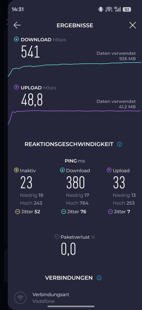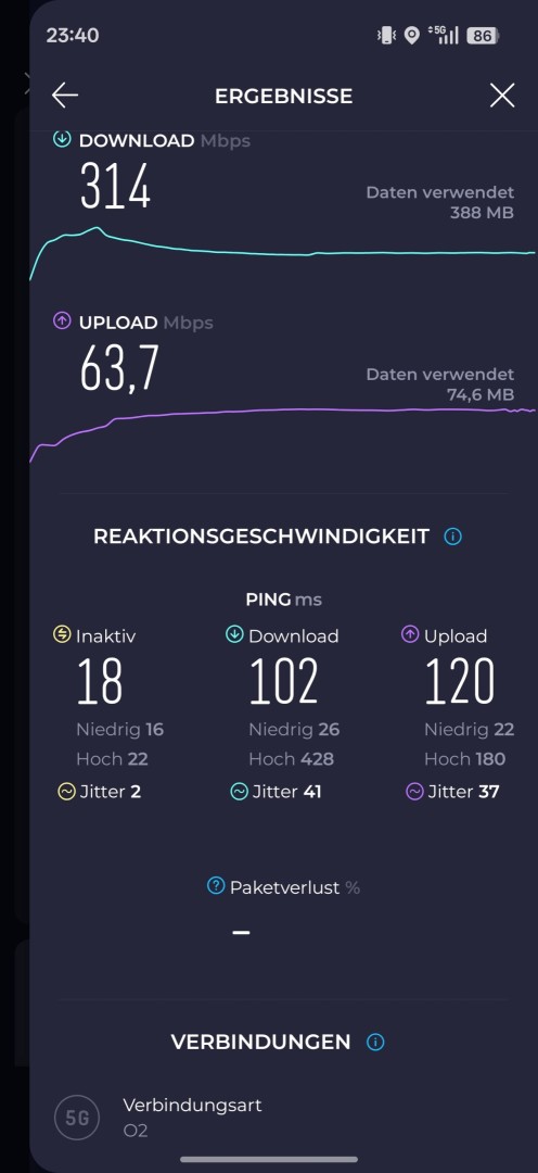 Beim Import des Oppo Find X9 Pro handelt man sich keine Mobilfunk Probleme ein. Die Frequenzunterstützung für Deutschland fällt vollständig aus, sowohl für o2 als auch Vodafone und Telekom. Der Mobilfunkempfang erwies sich im Test als exzellent. Es traten keine Einschränkungen in Gebäuden auf, die Performance in signalschwachen Gegenden war gut. Unerwartete Aussetzer blieben aus. Ein 5G Speed-Test im o2 Netz bei Nacht erreichte etwas über 400Mbit/s Peak, im Schnitt 314Mbit/s. Der Upload lag über 60Mbit/s. Dual SIM funktioniert mit zwei Nano SIM Karten. eSIM steht nur in der Global und EU Version zur Verfügung, bei der China Version fehlt eSIM.
