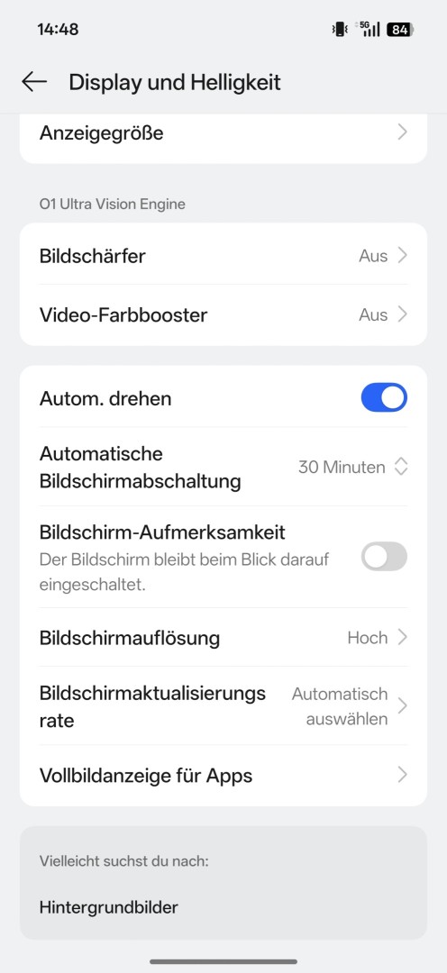 Die Auto Helligkeit arbeitet mit zuverlässiger Regelung. Der Dark Mode lässt sich mit Zeitplanung versehen und in der Intensität anpassen. Beim Farbmanagement stehen Presets und eine Farbtemperaturanpassung zur Verfügung, eine Profi Kalibrierung mit RGB Werten, Gamma oder Kontrast fehlt jedoch. Augenkomfortmodi mit warmer Darstellung und ein Blaulichtfilter sind verfügbar. Schriftart, Schriftgröße und Skalierung lassen sich nach Wunsch einstellen. Die Bildschirmauflösung kann gewählt werden, entweder in voller Auflösung oder mit 2354 x 1080 Pixeln für bessere Performance und geringeren Energieverbrauch. Optional bleibt der Bildschirm dauerhaft aktiv, wenn der Blick darauf gerichtet ist. Die Refresh Rate arbeitet wahlweise automatisch oder fest mit 120Hz beziehungsweise 60Hz.