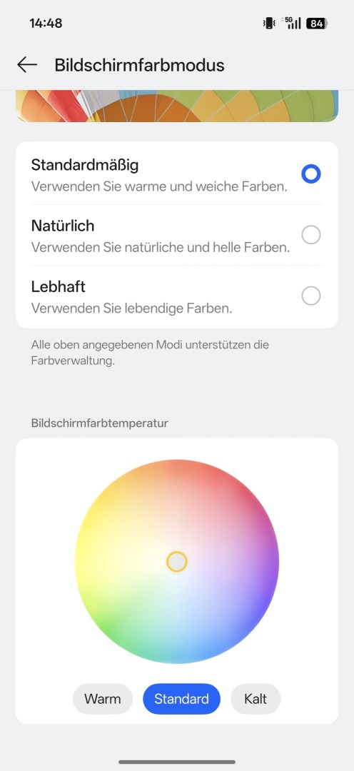 Das hochwertige Panel liefert eine scharfe Darstellung mit sehr guter Blickwinkelstabilität. Beim Kippen des Geräts tritt weder Farbschillern noch ein hoher Helligkeitsabfall auf. Die Farbdarstellung fällt ab Werk sehr gut aus. Die Farben wirken lebendig, aber dennoch natürlich. Der Weißwert zeigt sich neutral. Bilder und Videos kommen gut zur Geltung, auch HDR Inhalte werden sehr gut wiedergegeben. Das Display unterstützt HDR10+ und Dolby Vision. Über die Funktion "Naturton" lässt sich die Farbdarstellung automatisch an das Umgebungslicht anpassen.