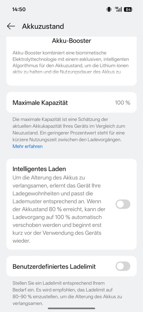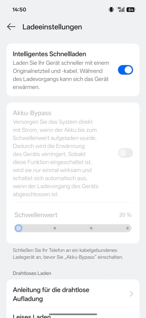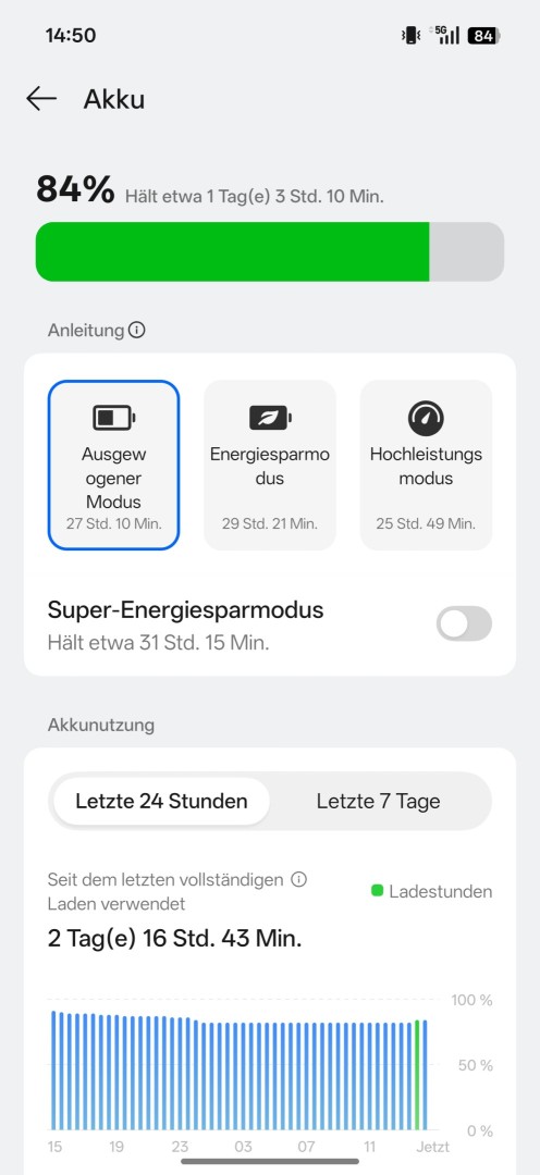 Die Akkueinstellungen fallen umfangreich aus. Verschiedene Energiemodi stehen zur Verfügung mit Ausgewogen, Energiesparen und Hochleistungsmodus. Ein Super Energiesparmodus sorgt für maximale Laufzeit. Die Akkugesundheitsanzeige (Restkapazität) bietet Schutzoptionen. Intelligentes Laden bis 80 Prozent lädt erst auf 100 Prozent wenn das Gerät basierend auf dem Nutzungsmuster benötigt wird. Alternativ steht ein benutzerdefiniertes festes Ladelimit zur Verfügung. Intelligentes Schnellladen nutzt höhere Ladeleistung basierend auf der Temperatur (nur mit SuperVOOC). Eine Akku Bypass Option steht für Gaming am Netzteil bereit. Drahtloses Aufladen lässt sich wahlweise leise (weniger Leistung) oder schnell (höhere Leistung, aktiver Lüfter in der Ladestation) betreiben. Reverse Charging funktioniert per USB-C und drahtlos (nur bis 10 Watt).