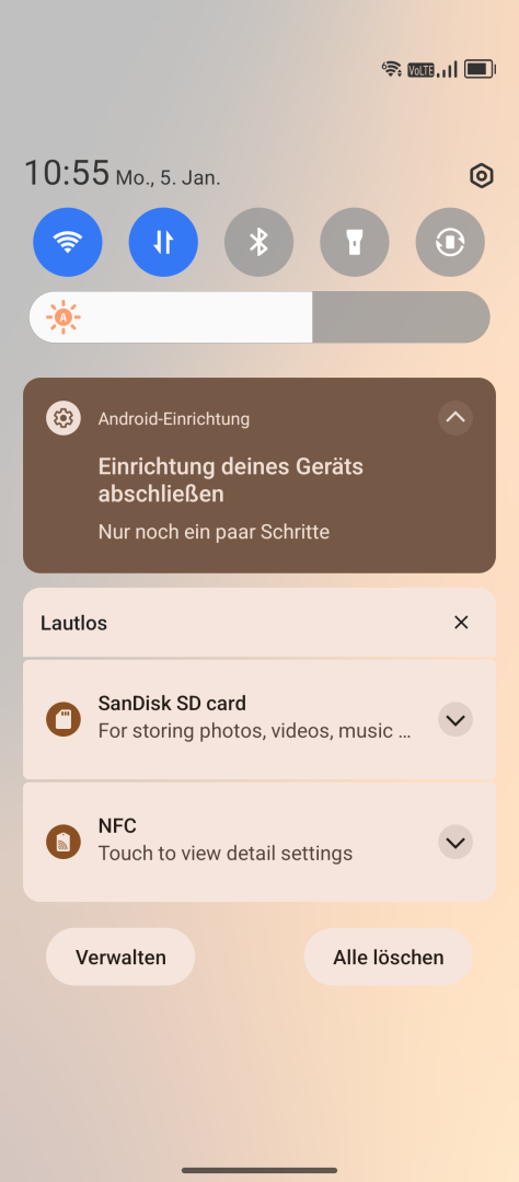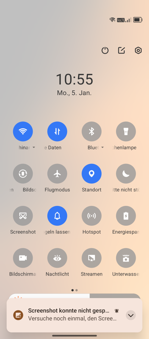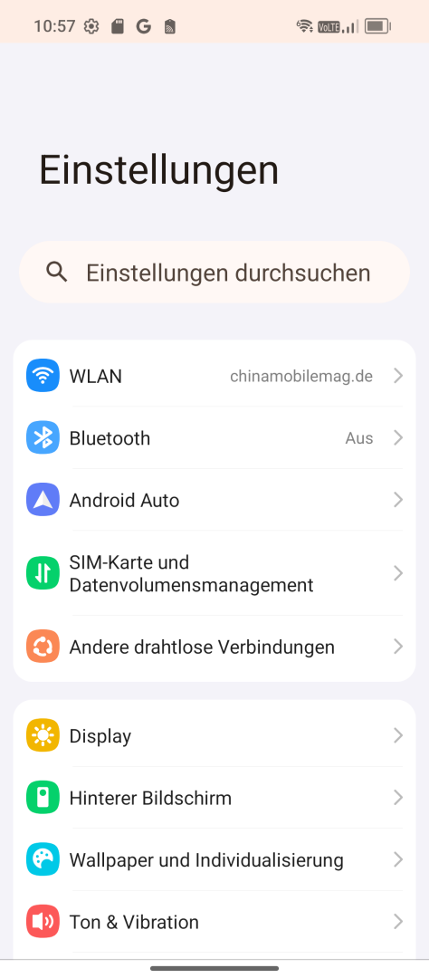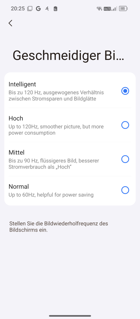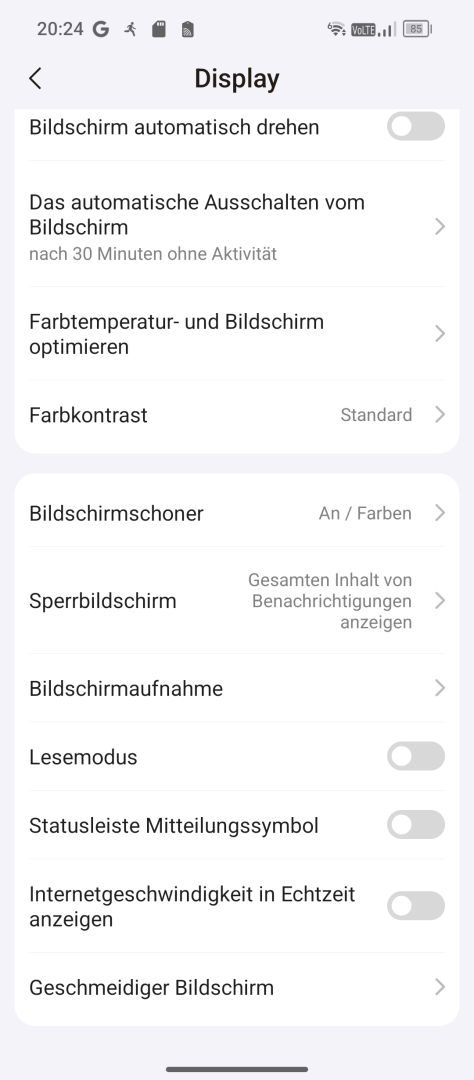 Die Displayeinstellungen fallen typisch für Android aus. Auto Helligkeit oder manuelle Einstellung, Dark Mode und Nachtlicht stehen zur Verfügung. Schriftart und Skalierung lassen sich anpassen. Das Farbmanagement bietet drei Presets (Normal, Hell, Professionell). Das Professionell-Preset schaltet einen Regler für die Farbtemperatur frei, sollte einem die Werkseinstellung zu kühl sein. Die Refresh Rate ist einstellbar (Intelligent, Hoch für feste 120Hz, Mittel für feste 90Hz, Normal für feste 60Hz). Da es sich um ein LCD Display handelt, gibt es logischerweise kein Always-On Display. Eine Status LED ist ebenfalls nicht vorhanden.