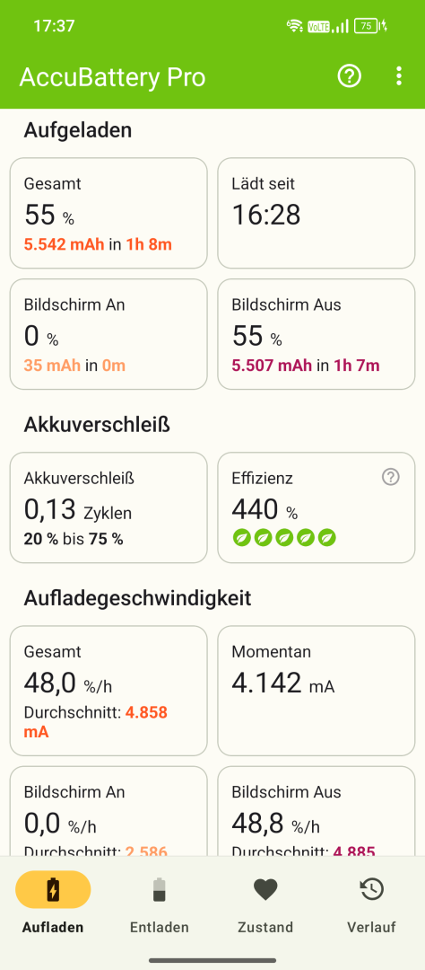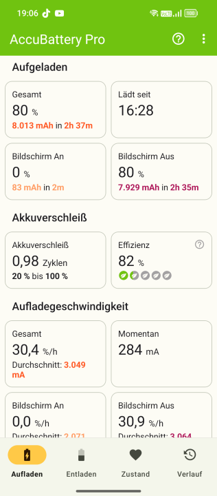Aufladen kann das Oscal Tank 1 trotz des extrem großen Akkus recht schnell. Es wird bis 55 Watt Fast-Charging unterstützt. Ein Netzteil ist leider nicht Teil des Lieferumfangs. USB-PD Fast-Charging wird allerdings unterstützt. Mit einem 40W PD-Charger eines Drittanbieters wurden im Test 39 Watt Ladeleistung erreicht. Damit wurde der Akku in 1:08 Stunden von 20 auf 75% geladen. Eine externe Messung der in den Akku fließenden Energie ergab 20.140mAh (gemessen bei 5V / 2A Ladespannung und Strom). In 2:37 Stunden war der Akku voll. Die Akkuschutz-Optionen fallen vorbildlich aus. Das Oscal Tank 1 bietet intelligentes und manuelles Ladelimit, beispielsweise auf 80%.
