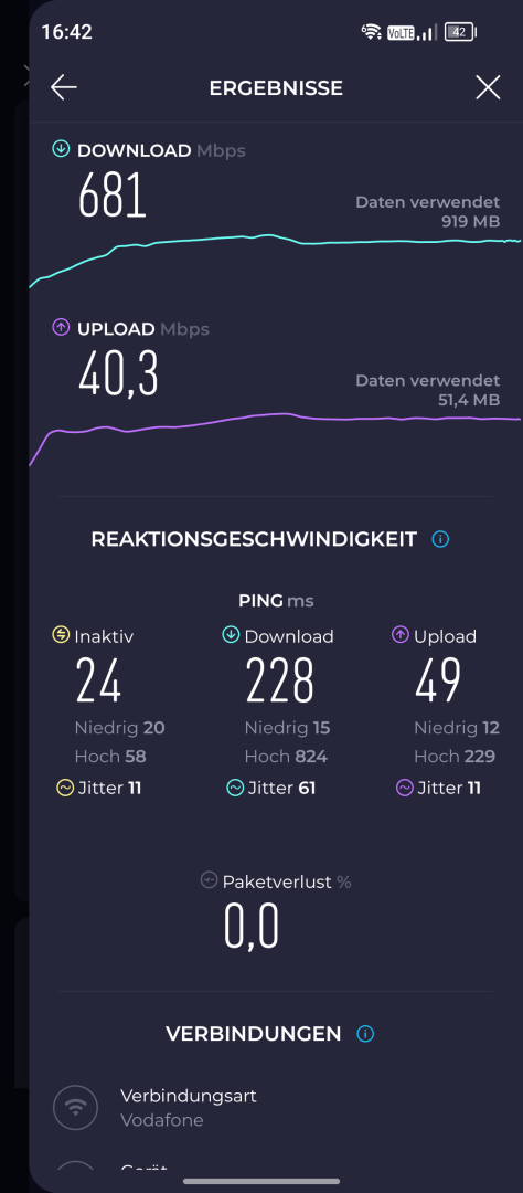 Das WLAN punktet mit Wi-Fi 6E Support (AX WLAN). Auch hier zeigt sich sehr guter Empfang mit ordentlicher Signalstärke in Distanz zum Router. Der Speed Test neben dem Router (Fritz!Box 6660 Cable mit Gigabit Cable) erreicht absolut solide 681Mbit/s. Ein Stockwerk darunter werden noch exzellente 428Mbit/s gemessen.