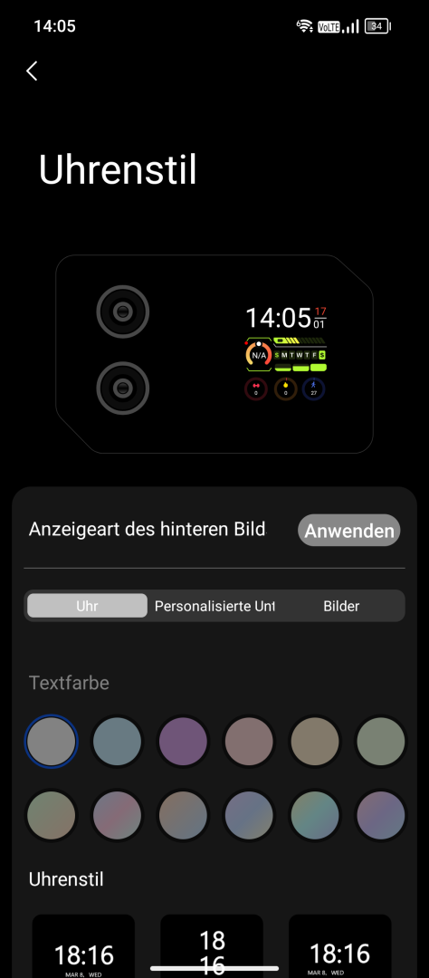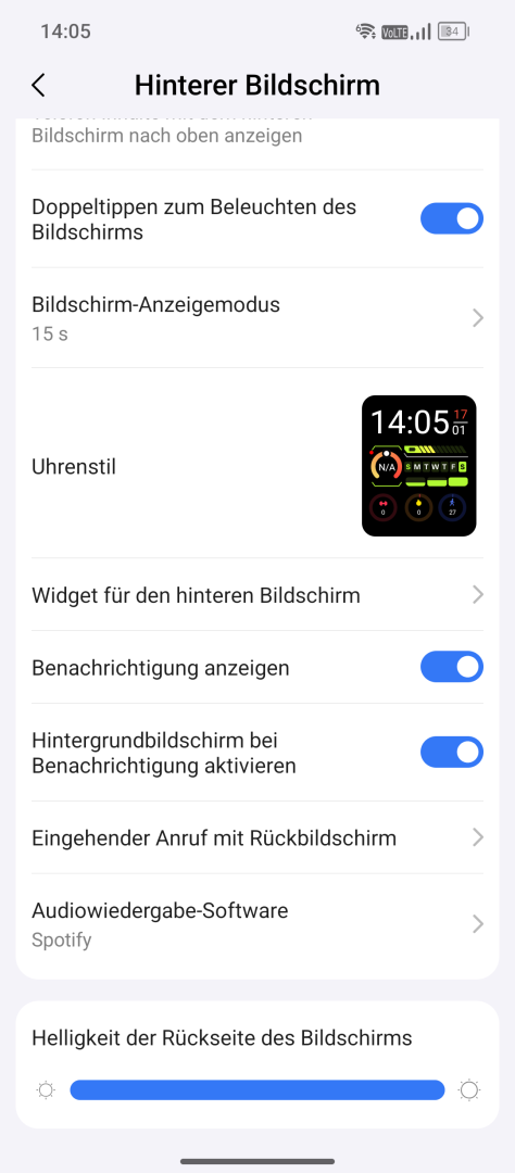 Das Sekundärdisplay fällt etwas umfangreicher aus als man es sonst von kleinen Herstellern gewohnt ist. Es bietet Kamera-Nutzung und Benachrichtigungen. Anrufe lassen sich über das Rückseitendisplay annehmen. Zusatzwidgets für Schrittzähler, Musiksteuerung, Wetter und Kompass sind verfügbar.