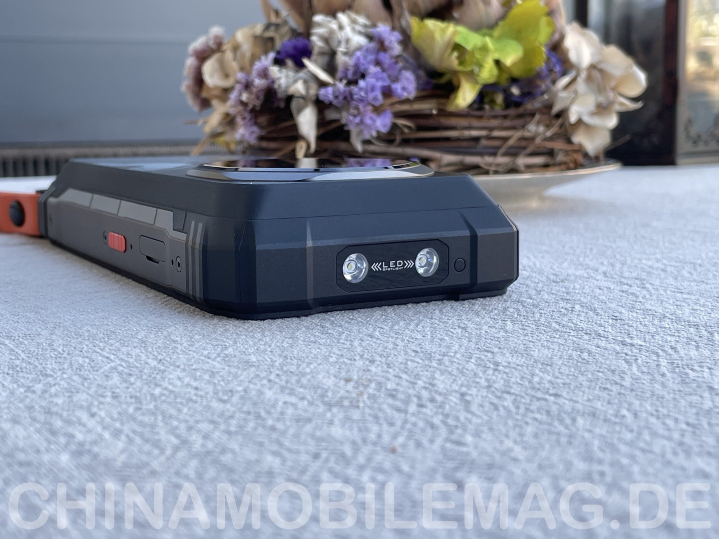Die Oberseite trägt zwei LEDs als Taschenlampe oder SOS Signal sowie einen Infrarotblaster. Die integrierte Taschenlampe wird ausreichend hell. Der Lichtkegel ist etwas fokussiert und rund. Helligkeit und Reichweite fallen nicht bombastisch aus, für alltägliche Einsatzzwecke reicht es jedoch völlig. Die Taschenlampe lässt sich per Funktionstaste triggern, was allerdings nur die entsprechende App startet. Licht gibt es erst über das Display, was unpraktisch ist. Zur Wahl stehen normales Leuchten oder ein SOS Signal.