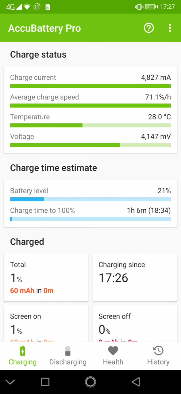Und dann ist da noch das Thema Fast Charging, wofür Oukitel eine eigene Technik mit 30 Watt Leistung nutzt. Das Netzteil liefert 5V und satte 6A an das Smartphone. Davon kommen am Akku laut AccuBattery noch bis zu 4,8 Ampere an. Und die Ladezeit ist wirklich gut. Ausgehend von 20% lädt das Smartphone binnen 70 Minuten auf 75%. Bis rauf zu 100% vergehen etwas mehr als zwei Stunden. Das Smartphone erwärmt sich dabei deutlich aber nicht unangenehm. Nur die Metallstecker vom USB Kabel werden richtig heiß.