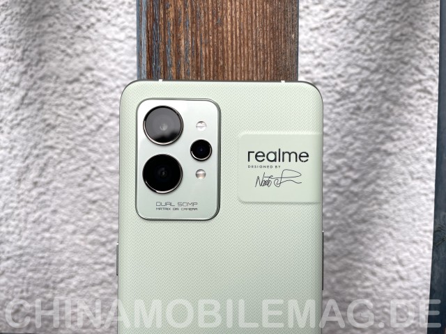 Uns hat zum Testen die Kunststoff-Variante in Grün erreicht. Alternativ gibt es auch eine weiße Version davon. Das Besondere an der Kunststoff-Version ist, dass diese aus einem Bio-Polymer besteht und damit relativ umweltfreundlich ist. Das Finish der Rückseite ist grob gemustert und fühlt sich dadurch rau und griffig an. Realme nennt das Design "Paper Tech", da hier das Gefühl von Papier entstehen soll. So ganz zutreffend ist die Umschreibung allerdings nicht. Das Handgefühl erinnert vielmehr an ein raues Kunstleder als an Papier. Ein nettes Design-Element ist das silberne Realme-Logo neben dem Kameramodul, unter welchem sich die Unterschrift des verantwortlichen Designers (Naoto Fukasawa) befindet.