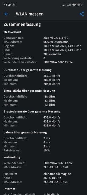 WLAN unterstützt das Redmi Note 11 mit maximal dem AC-Standard. Die von uns ermittelte maximale Link-Geschwindigkeit liegt bei 433Mbit/s (Brutto). Netto wurden im Test neben dem Router durchschnittlich 258Mbit/s gemessen. Ein Stockwerk unter dem Router waren es im Schnitt noch 135Mbit/s. Damit kann man den WLAN Empfang als sehr gut bezeichnen. Bluetooth unterstützt das Redmi Note 11 in Version 5.0 und liefert hier eine ordentliche Reichweite.