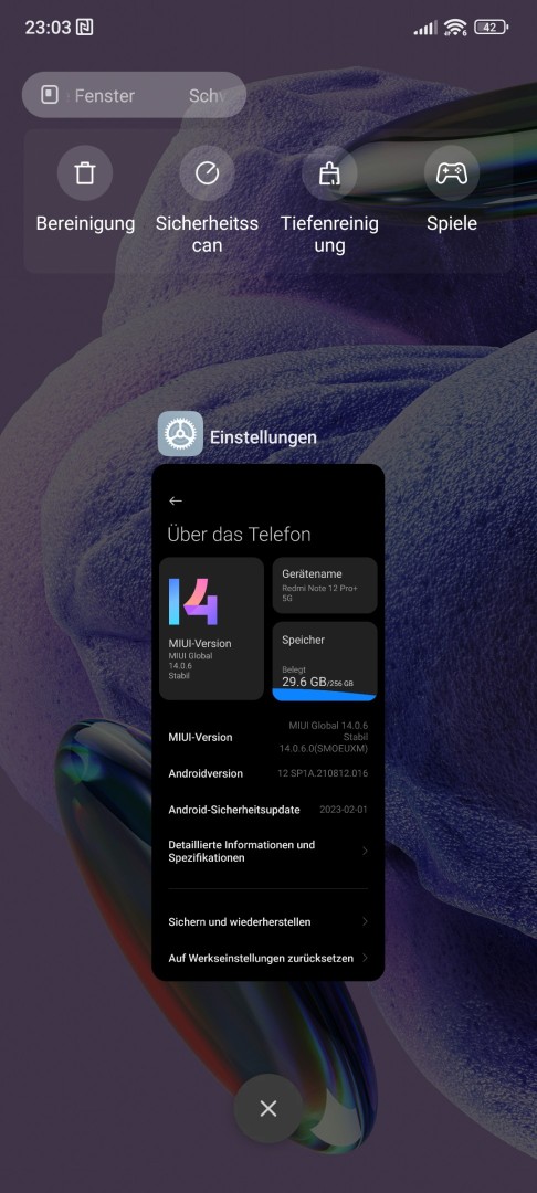 Auf dem Redmi Note 12 Pro+ 5G läuft das aktuelle MIUI 14 in der Global Version mit deutscher Sprache und vorinstallierten Google Diensten. Leider hat das Smartphone dieselbe Schwäche wie das Xiaomi 13 Lite und wird noch nicht mit Android 13 ausgeliefert. Stattdessen kommt noch Android 12 zum Einsatz. Android 13 wird aber zu einem späteren Zeitpunkt noch nachgeliefert. Der Sicherheitspatch wurde mit einem Update nach dem Einrichten (im März) auf den Stand vom Februar 2023 gebracht.