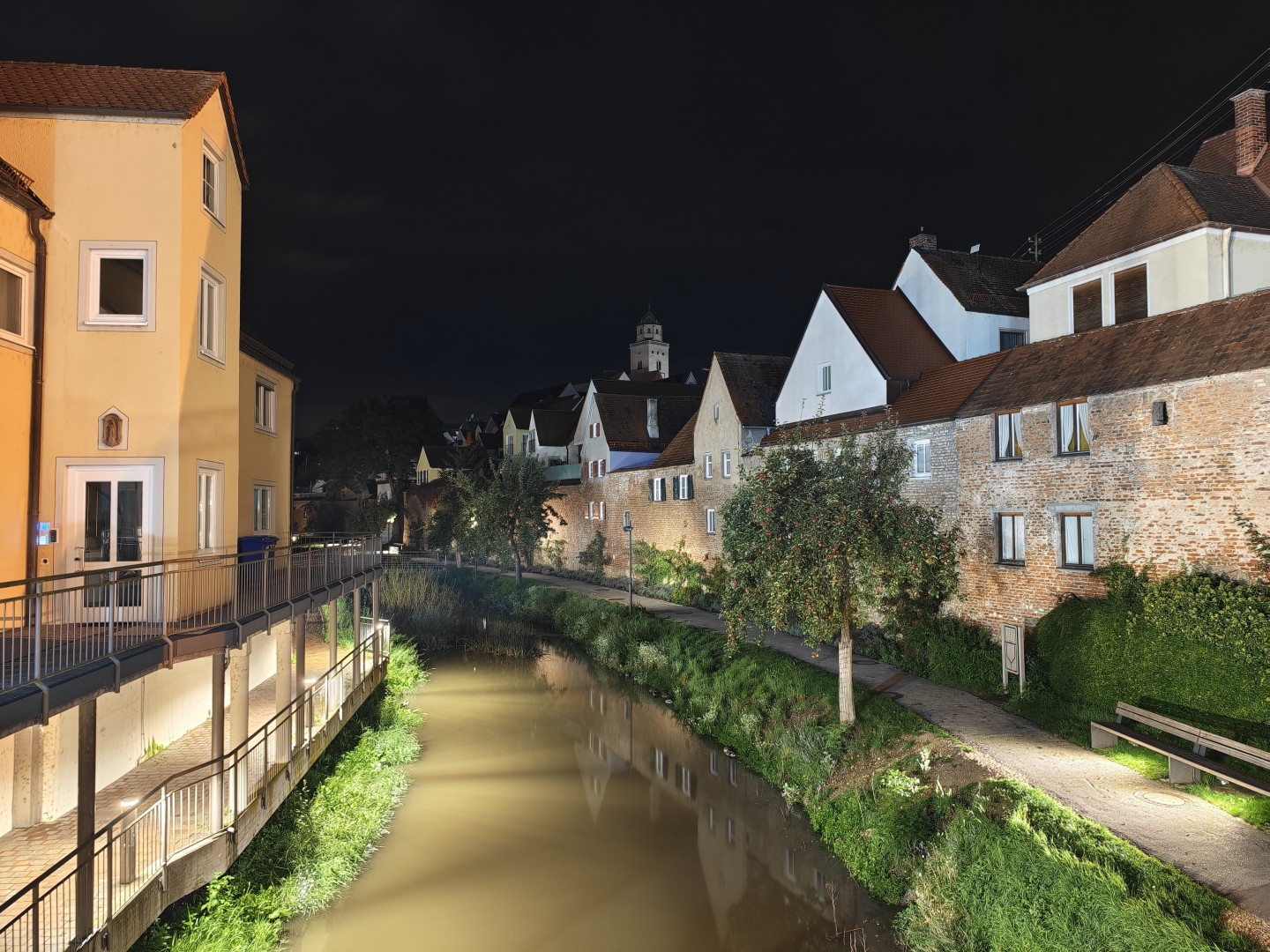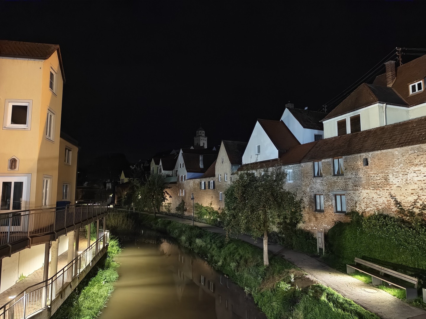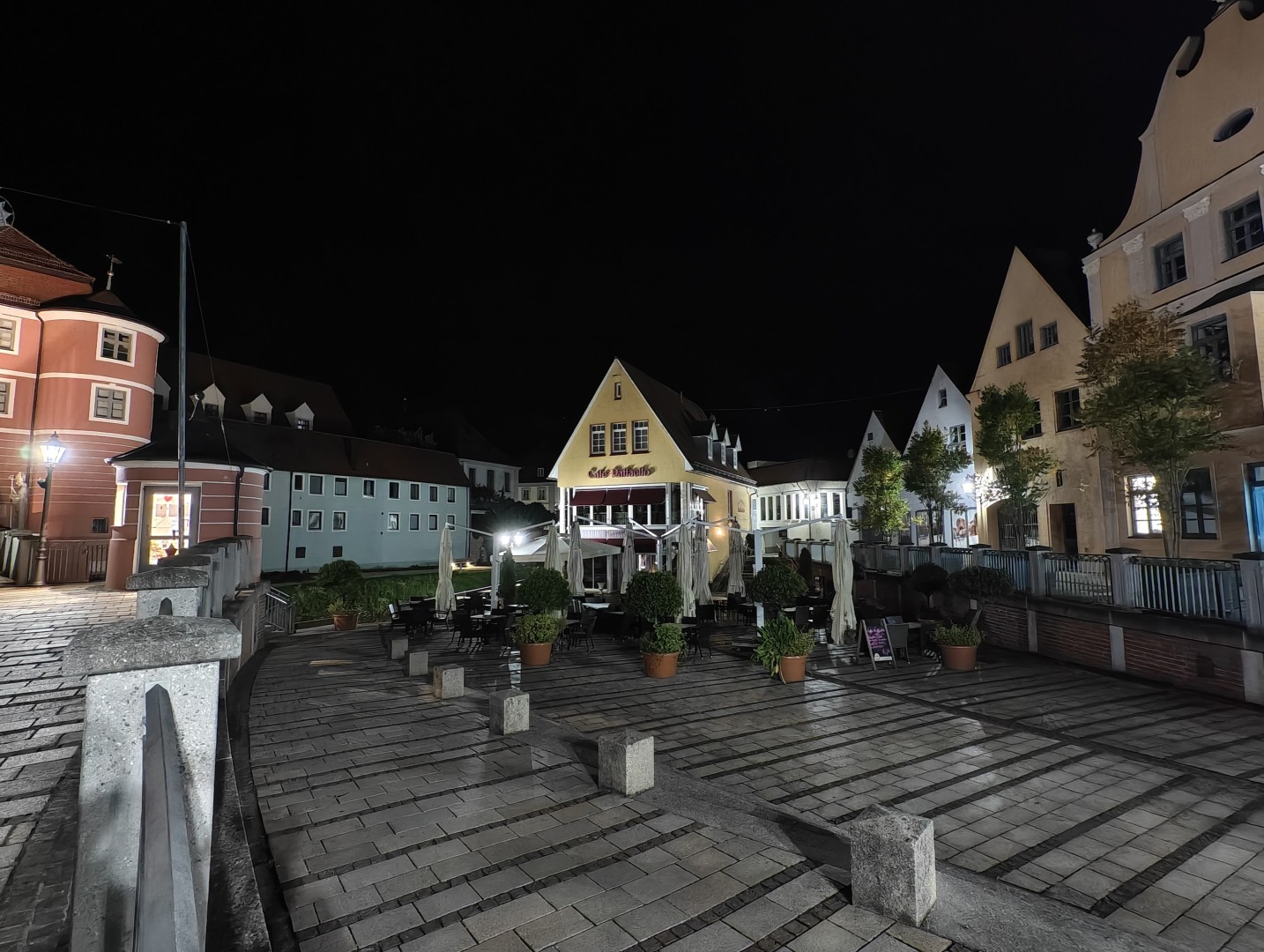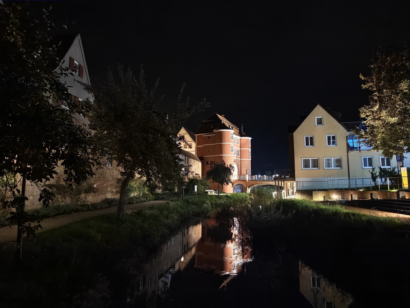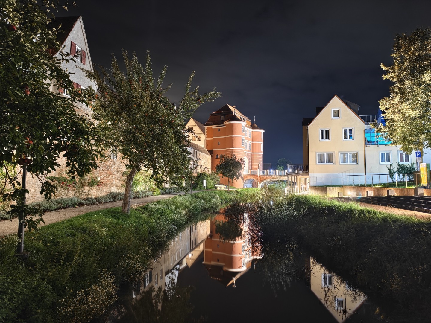 Die Langzeitbelichtung funktioniert mit Vollautomatik im Modus "Landschaft und Nacht" sehr gut. Das System erkennt automatisch, wenn ein Stativ genutzt wird, und verlängert die Belichtungszeit entsprechend. Die Testbilder erreichten bis zu 1:15 Minuten Belichtungszeit und lieferten zuverlässig gefällige Ergebnisse ohne Zutun. Die Schärfung verstärkt Konturen dezent, Gebäudekanten wirken knackig. Der Dynamikumfang bleibt hoch mit ausgewogener Schatten- und Highlight-Zeichnung. Sterne und punktuelle Lichtquellen im dunklen Himmel sind klar definiert. Der Autofokus arbeitet auch bei dunklen Motiven zuverlässig, die Fokussierung auf architektonische Details gelingt prompt. OIS-Jitter tritt nicht auf, die Aufnahmen bleiben scharf und detailliert auch bei langen Belichtungszeiten. Die Farbabstimmung ist stimmungsvoll und natürlich mit gutem Weißabgleich. Der Weißabgleich harmonisiert warme Laternen- und kühle Umgebungslichter zu einem natürlichen Gesamtton. Die Farbsättigung fällt etwas höher aus als im Night Mode. Pflasterstein- und Mauerstrukturen sowie Dächer und Bäume zeigen eine gute Detaildarstellung. Der Rauschanteil bleibt in dunklen Bereichen gering.
