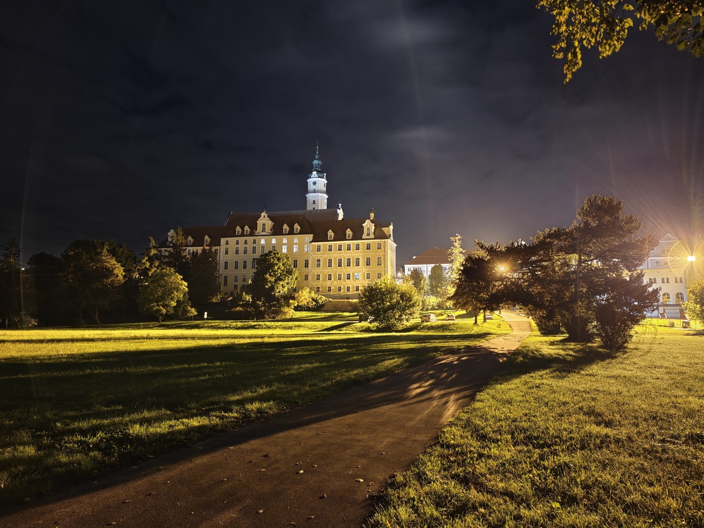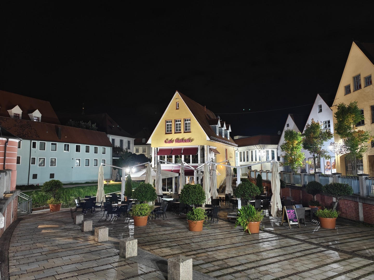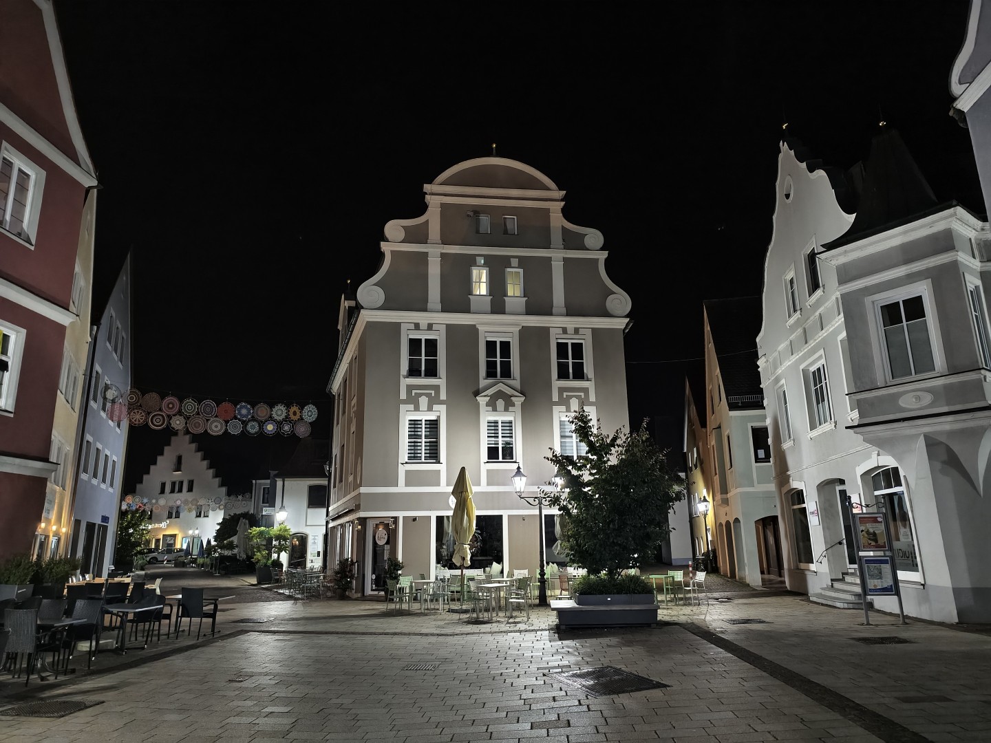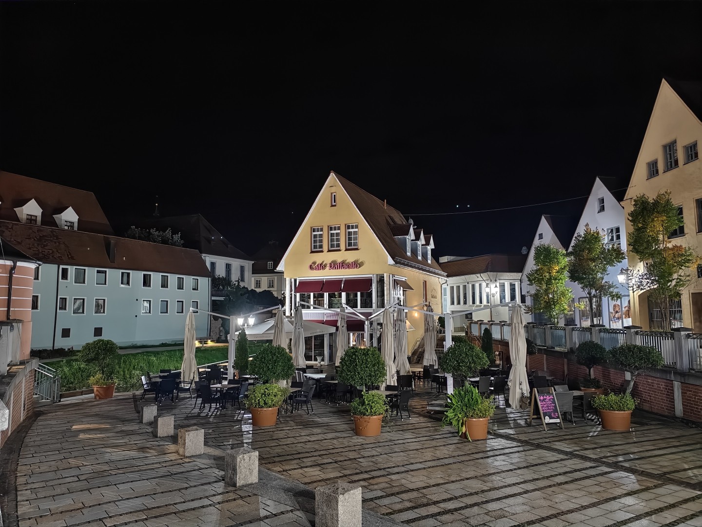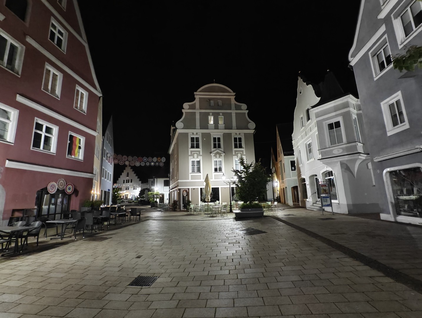 Die Langzeitbelichtung funktioniert mit Vollautomatik im Modus "Landschaft und Nacht" sehr gut. Das System erkennt automatisch, wenn ein Stativ genutzt wird, und verlängert die Belichtungszeit entsprechend. Die Testbilder erreichten bis zu 1:15 Minuten Belichtungszeit und lieferten zuverlässig gefällige Ergebnisse ohne Zutun. Die Schärfung verstärkt Konturen dezent, Gebäudekanten wirken knackig. Der Dynamikumfang bleibt hoch mit ausgewogener Schatten- und Highlight-Zeichnung. Sterne und punktuelle Lichtquellen im dunklen Himmel sind klar definiert. Der Autofokus arbeitet auch bei dunklen Motiven zuverlässig, die Fokussierung auf architektonische Details gelingt prompt. OIS-Jitter tritt nicht auf, die Aufnahmen bleiben scharf und detailliert auch bei langen Belichtungszeiten. Die Farbabstimmung ist stimmungsvoll und natürlich mit gutem Weißabgleich. Der Weißabgleich harmonisiert warme Laternen- und kühle Umgebungslichter zu einem natürlichen Gesamtton. Die Farbsättigung fällt etwas höher aus als im Night Mode. Pflasterstein- und Mauerstrukturen sowie Dächer und Bäume zeigen eine gute Detaildarstellung. Der Rauschanteil bleibt in dunklen Bereichen gering.