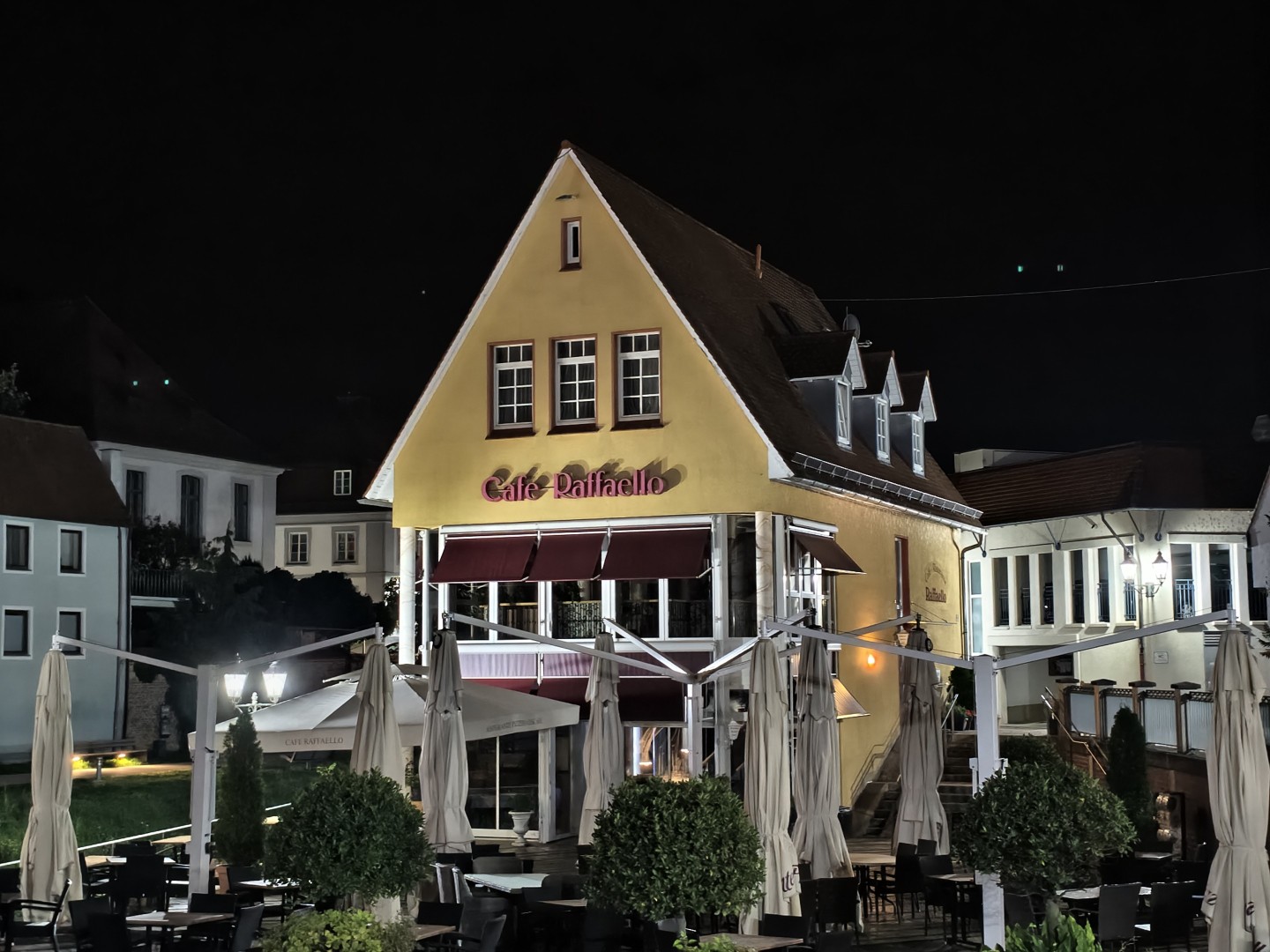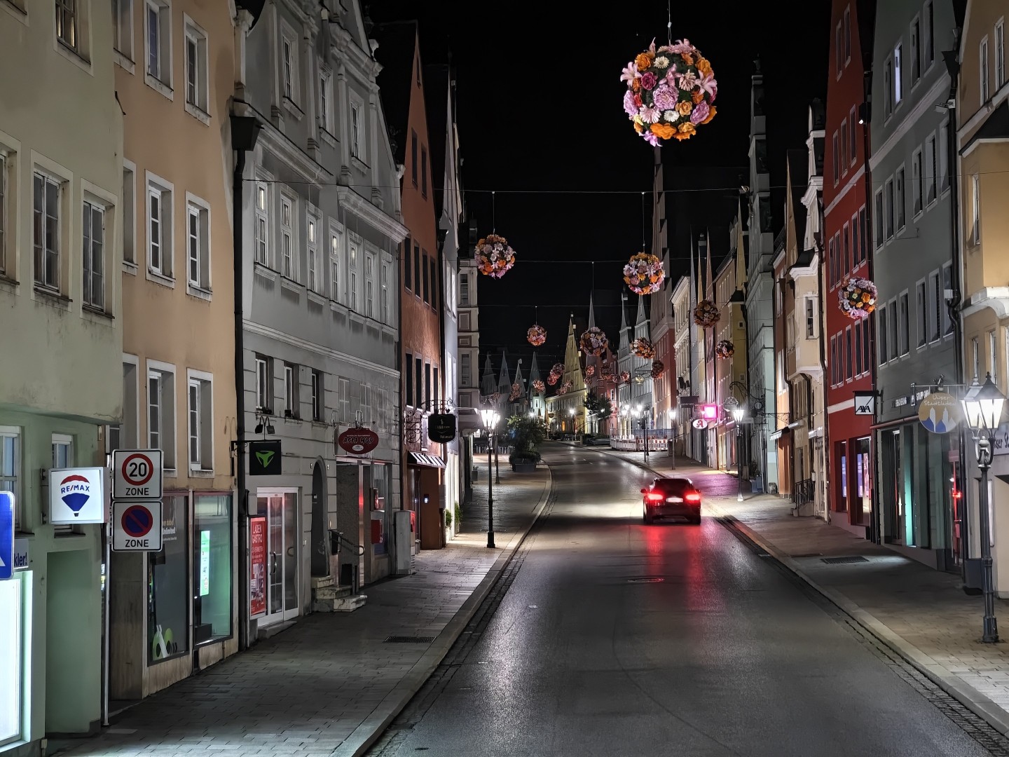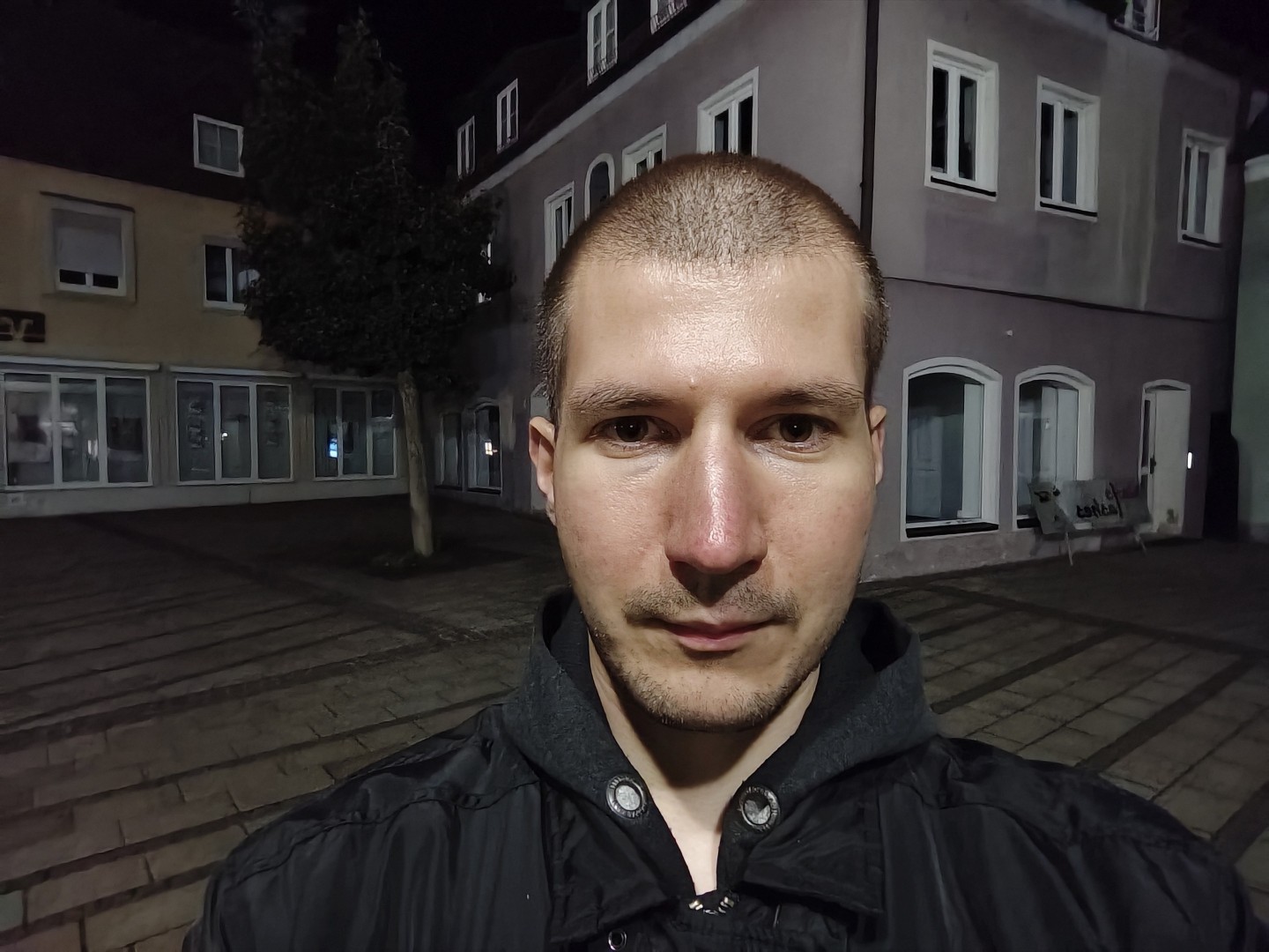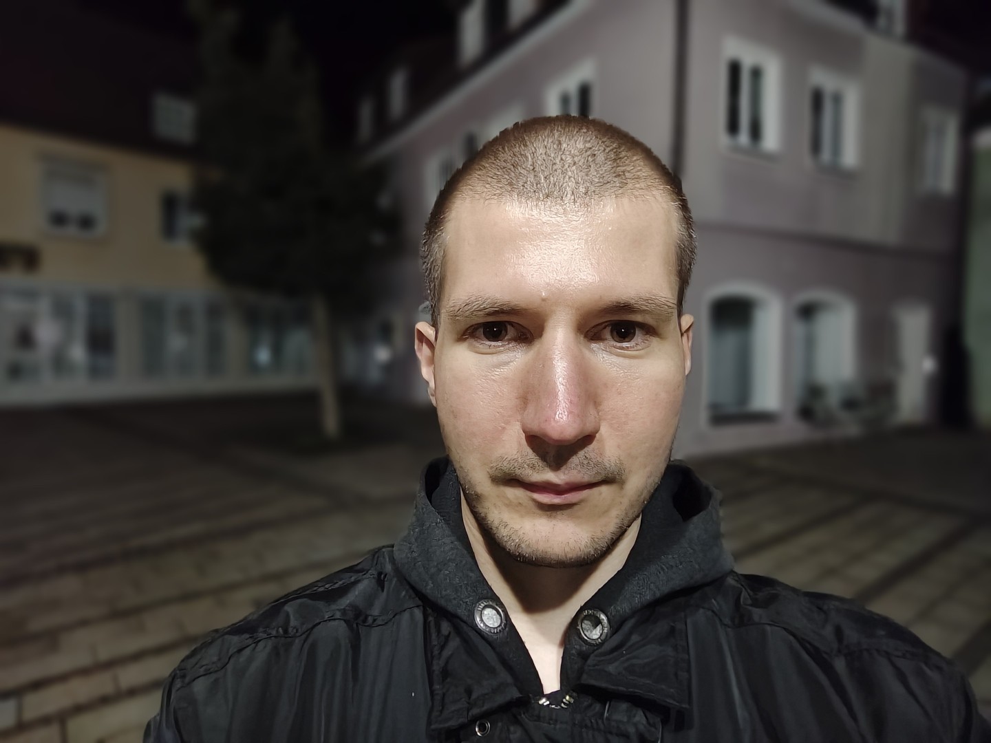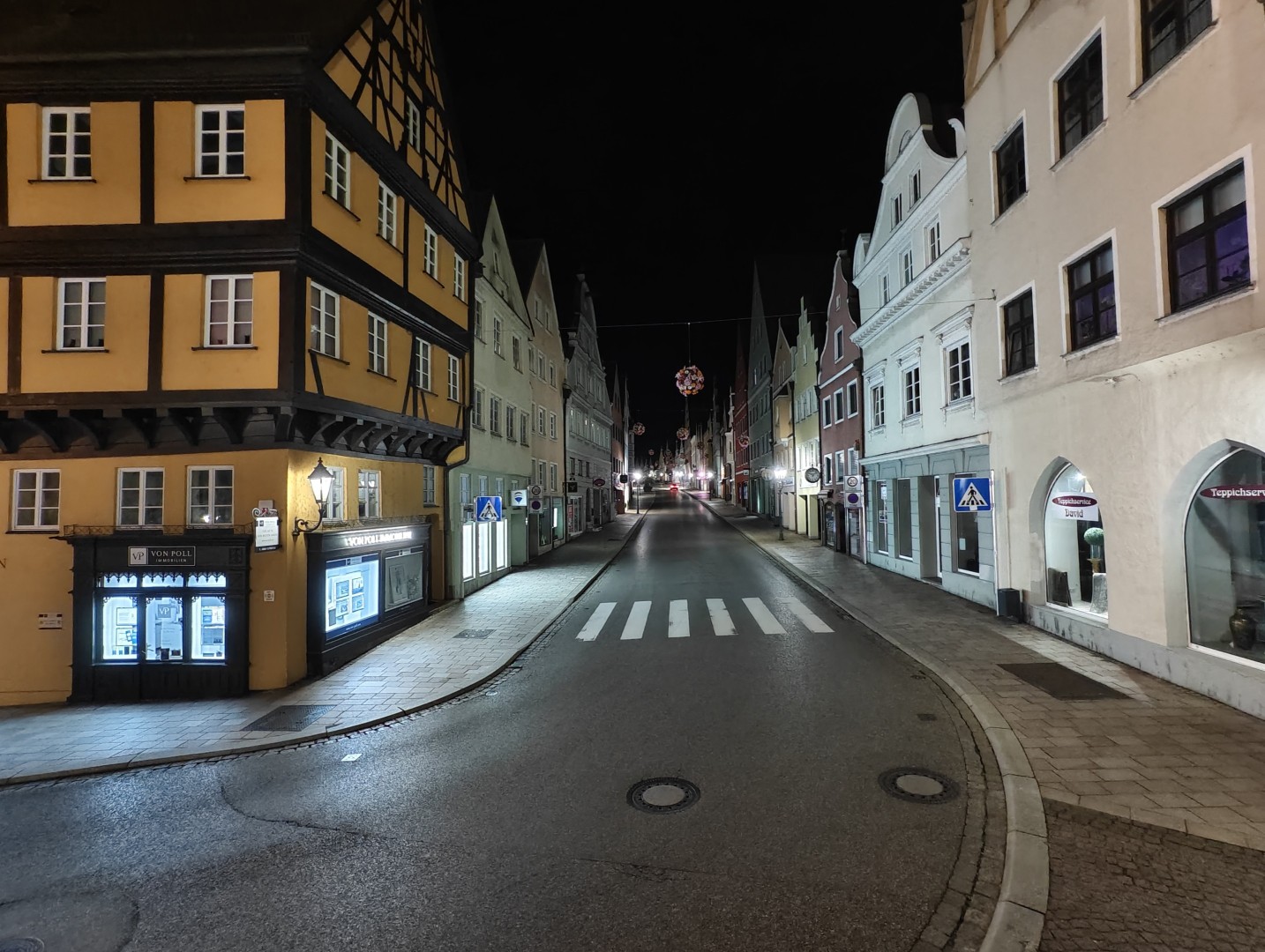 Der Nachtmodus wird automatisch aktiviert. Auch bei extrem wenig Umgebungslicht bleiben Fassaden- und Dachdetails gut erhalten. Rauschen wird effektiv unterdrückt, dunkle Himmel und Schattenpartien wirken flach aber rauscharm. Sterne werden im Night Mode nicht sichtbar. Der Weißabgleich funktioniert gut, die Farben bleiben natürlich mit stimmigen Gelb- und Orangetönen. Direkte Lichtquellen zeigen einen guten Dynamikumfang mit geringem Blooming. Der Autofokus zeigt keine Aussetzer. Feine Texturen weisen weiterhin eine gute Detaildarstellung auf, sofern ausreichend Kunstlichtquellen vorhanden sind.