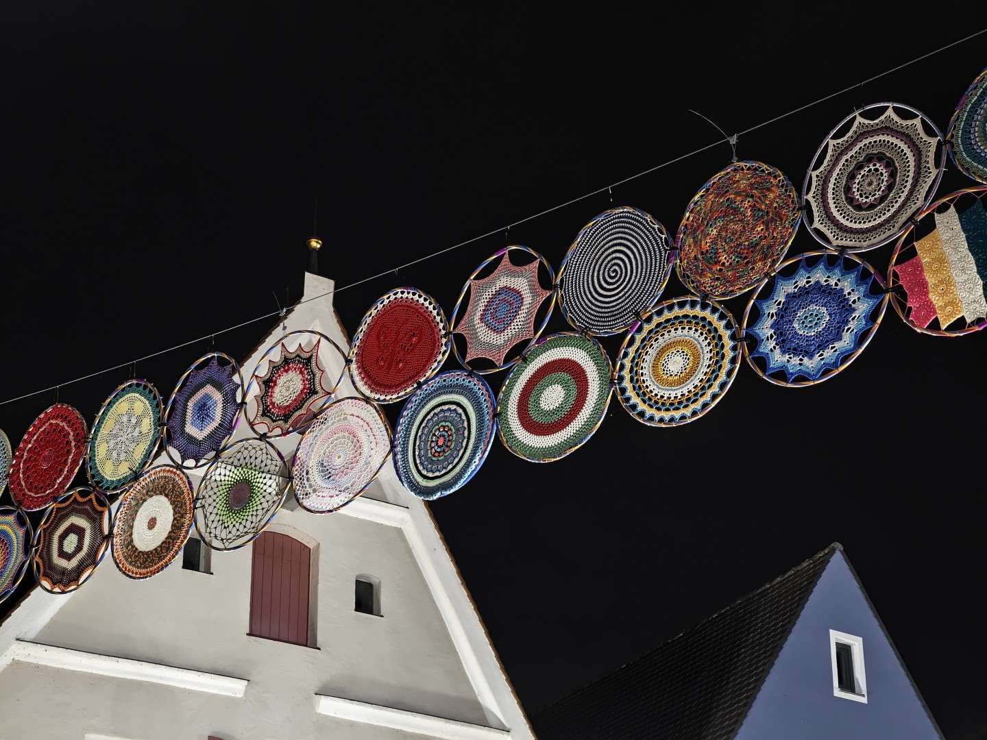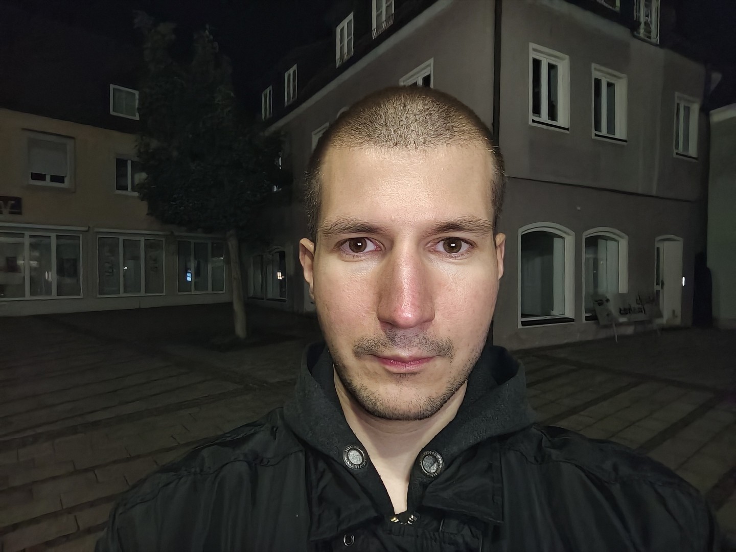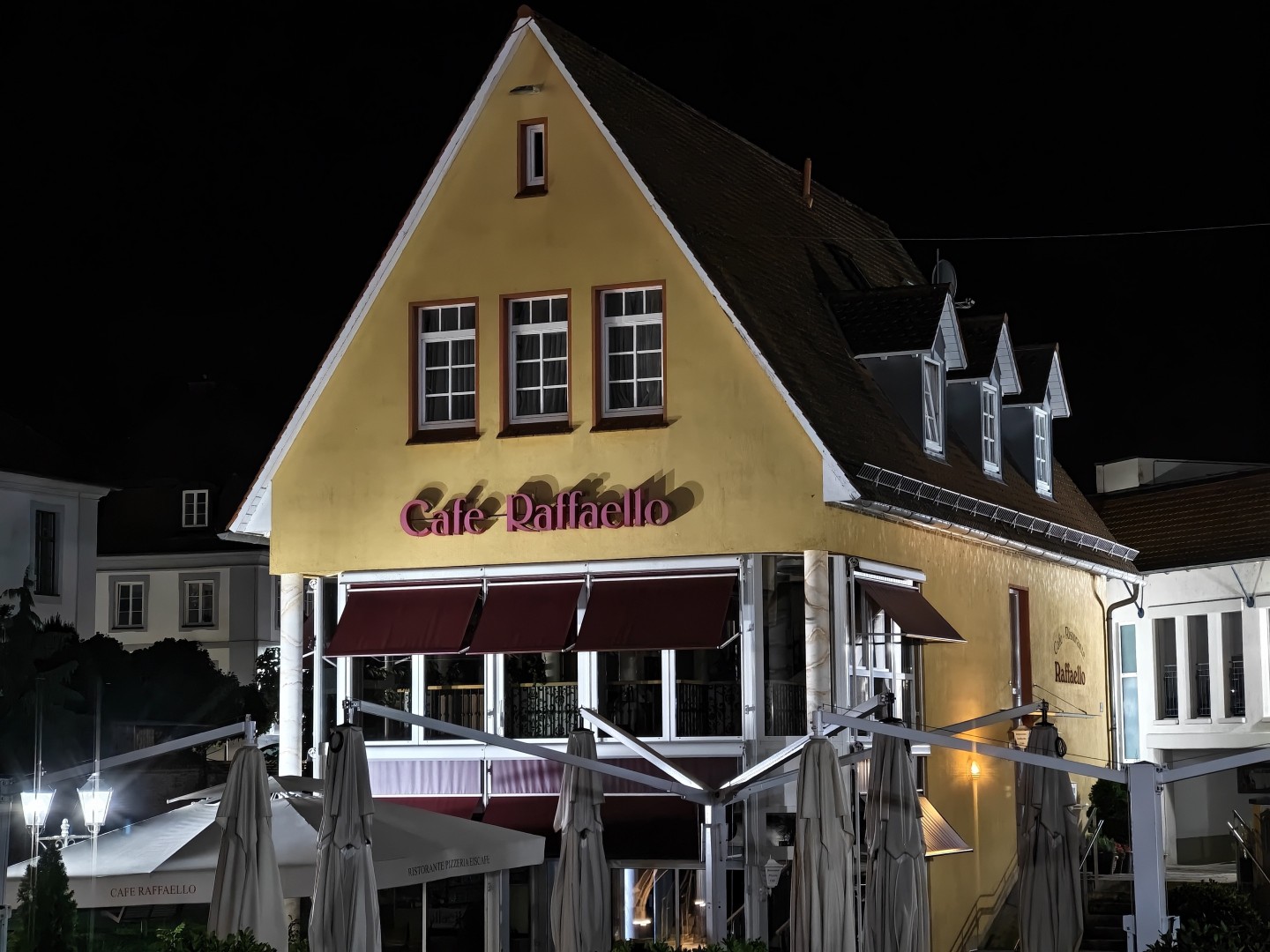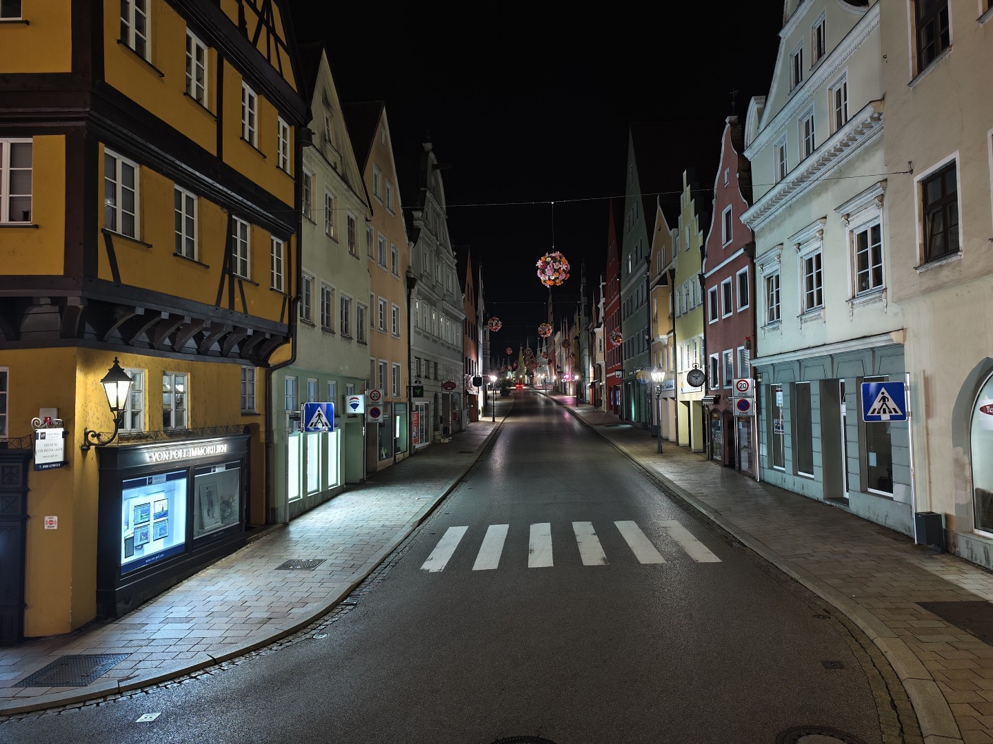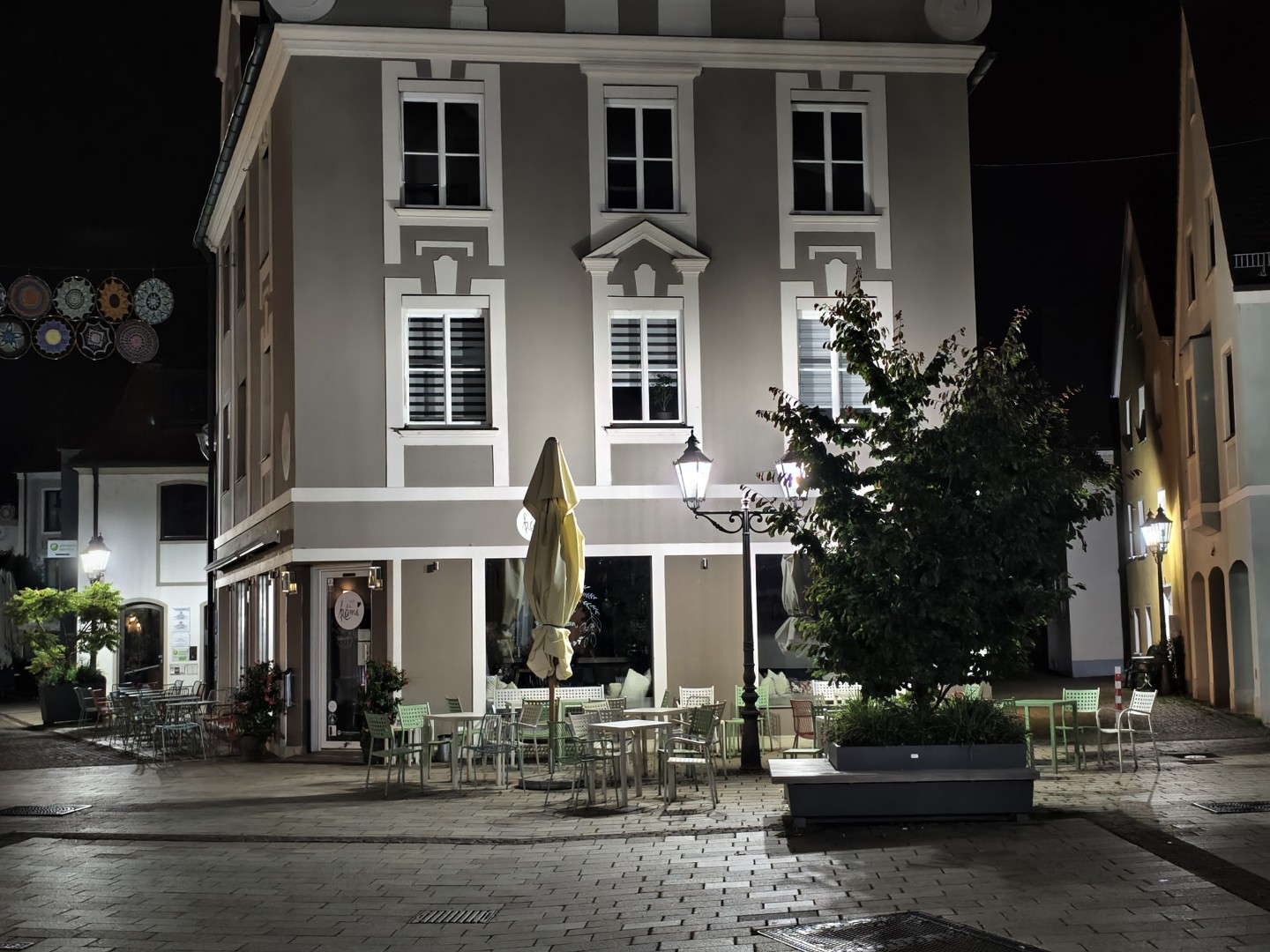 Der Nachtmodus wird automatisch aktiviert. Auch bei extrem wenig Umgebungslicht bleiben Fassaden- und Dachdetails gut erhalten. Rauschen wird effektiv unterdrückt, dunkle Himmel und Schattenpartien wirken flach aber rauscharm. Sterne werden im Night Mode nicht sichtbar. Der Weißabgleich funktioniert gut, die Farben bleiben natürlich mit stimmigen Gelb- und Orangetönen. Direkte Lichtquellen zeigen einen guten Dynamikumfang mit geringem Blooming. Der Autofokus zeigt keine Aussetzer. Feine Texturen weisen weiterhin eine gute Detaildarstellung auf, sofern ausreichend Kunstlichtquellen vorhanden sind.