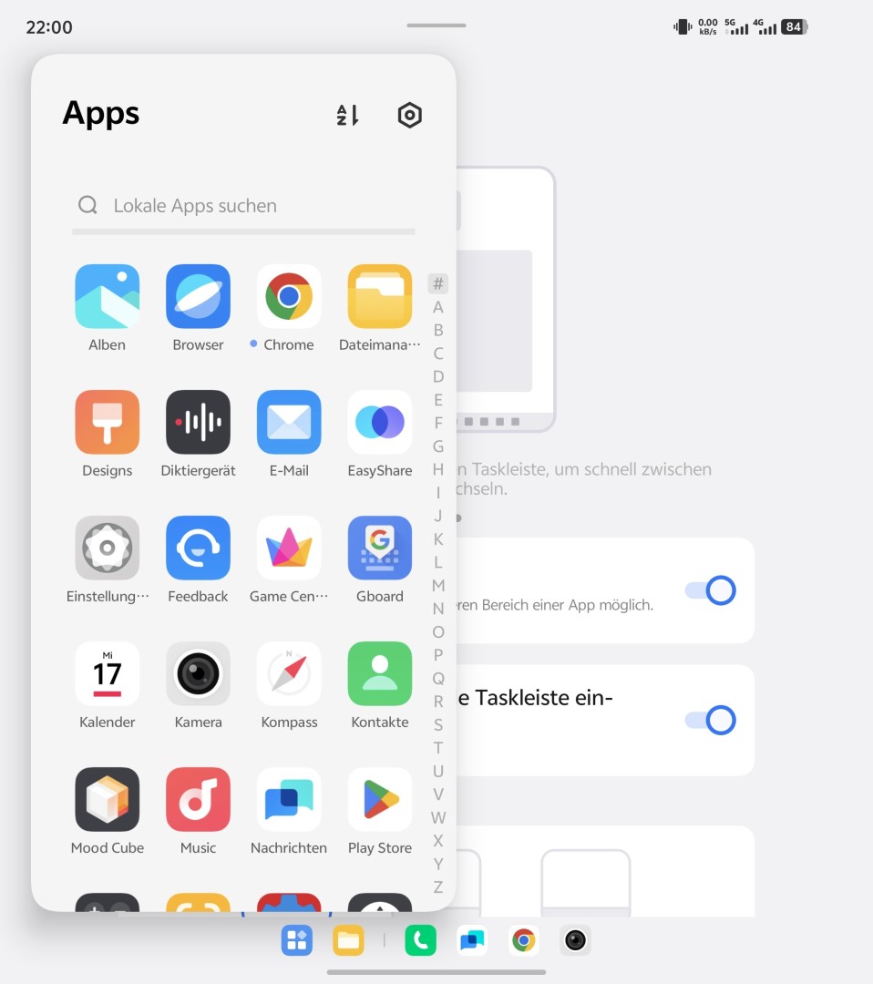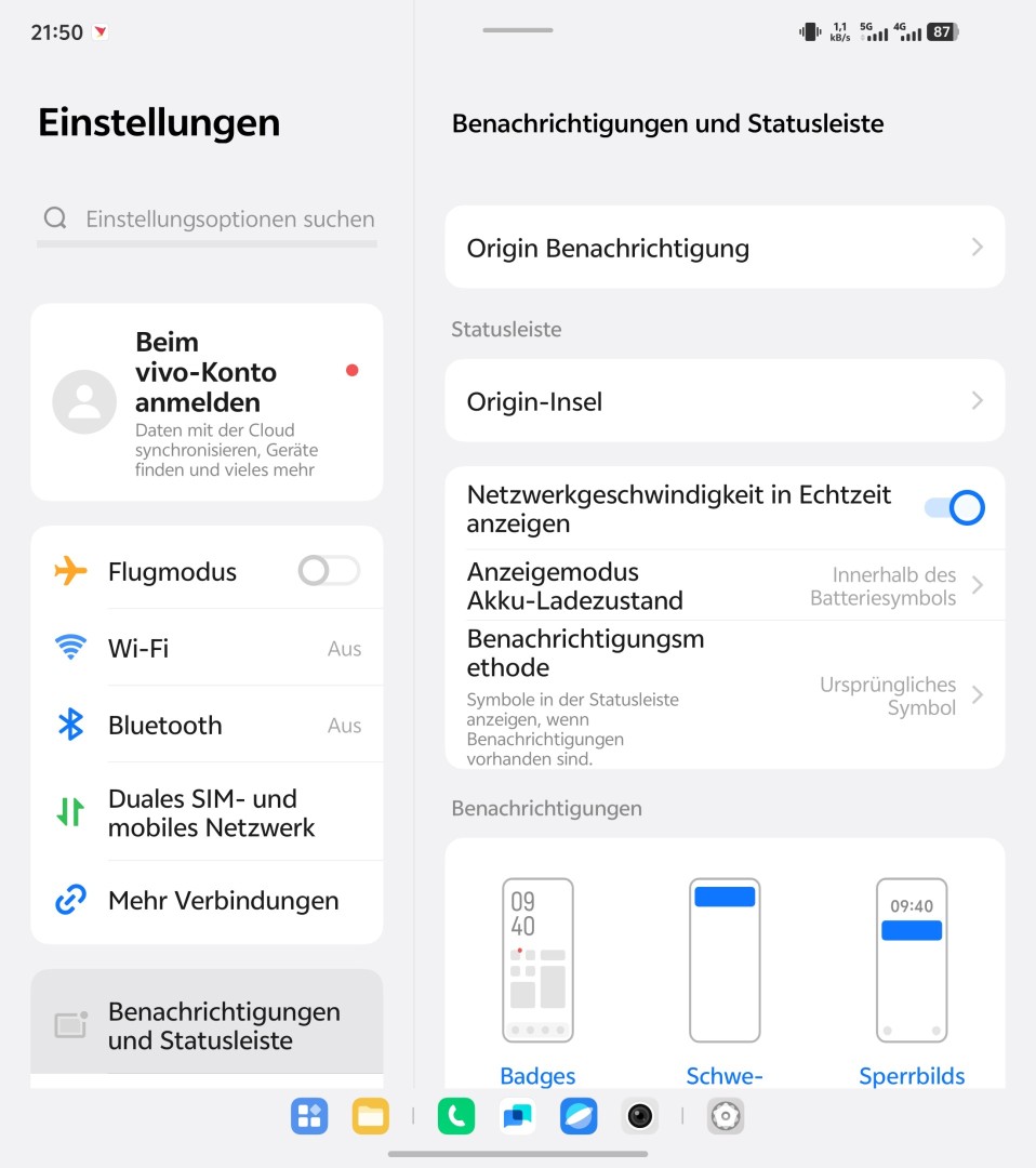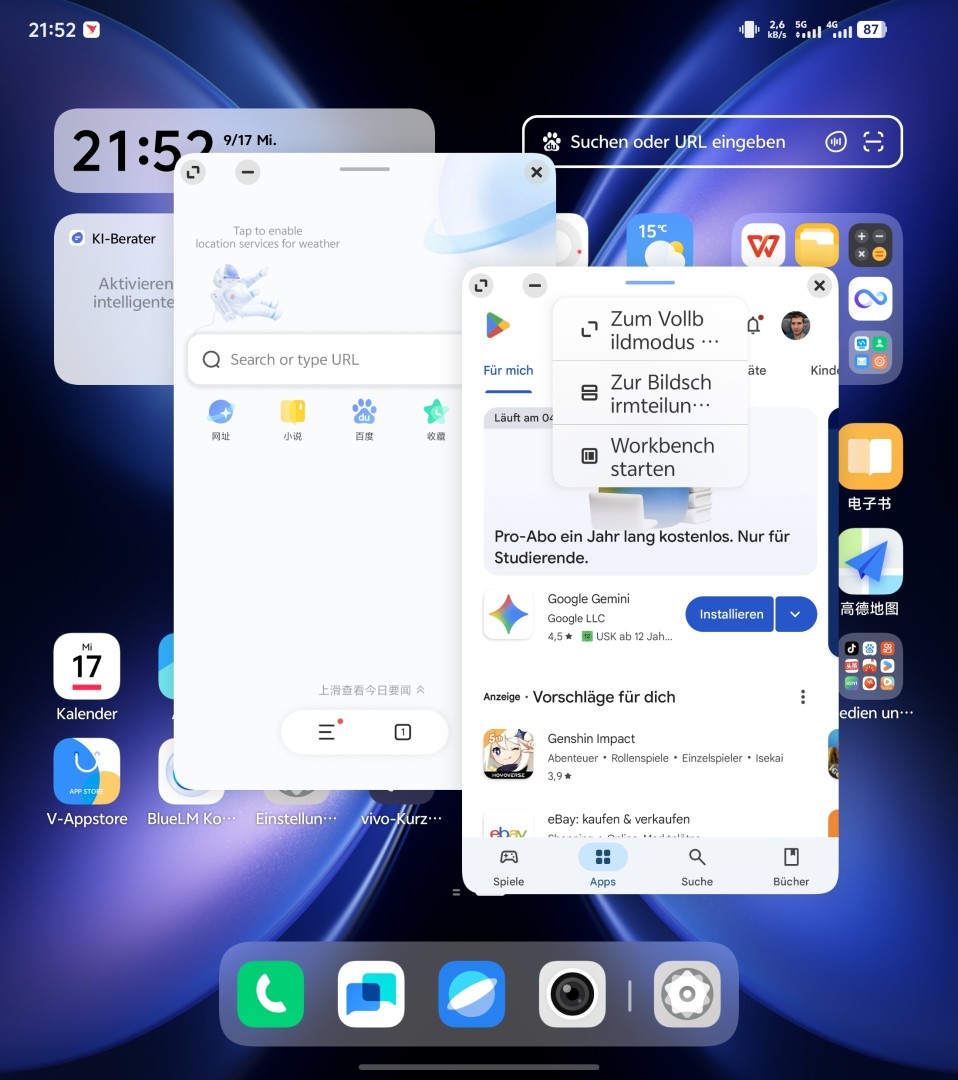 Praktisch für die Nutzung des Innendisplays ist die Workbench-Funktion. Hierbei handelt es sich um eine Kopie von Apple's Stage Manager, mit der sich Apps sehr bequem im Multitasking wechseln lassen. Offene Apps werden groß dargestellt, minimierte Apps als Thumbnail in einer Seitenleiste. Mit einmaligem Antippen kann man schnell zwischen den Apps wechseln. Auch Apps, die im Hintergrund normal pausieren wie beispielsweise YouTube, laufen im Workbench weiter, wenn eine andere App im Vordergrund genutzt wird. Der Betrieb von Apps in frei in der Größe veränderbaren und verschiebbaren Fenstern ist wie auf den normalen Vivo-Smartphones ebenfalls möglich.
