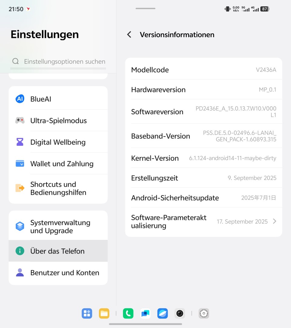 Die Sprachqualität beim Telefonieren zeigt sich sehr gut mit natürlichem und klarem Ton an beiden Enden. Der Telefonhörer des Vivo X Fold 5 wird laut genug für laute Umgebungen. Umgebungsgeräusche werden zuverlässig unterdrückt oder reduziert. VoLTE und VoWiFi werden unterstützt, wobei VoWiFi im Test mit dem o2-Netz nicht funktioniert hat.