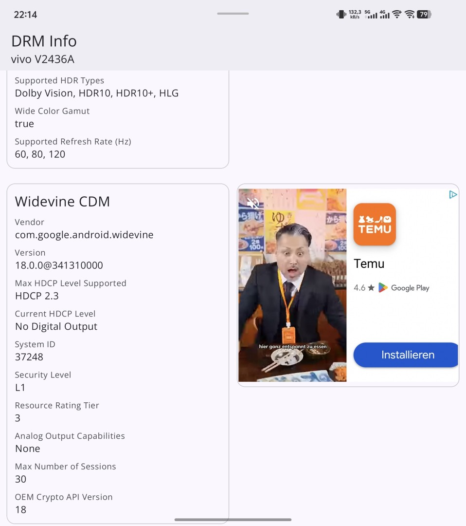 Die Google-Zertifizierung ist vorhanden, sodass Dienste nutzbar sind, die diese voraussetzen, beispielsweise Google Pay oder Banking-Apps. Auch die Widevine Level 1 DRM Zertifizierung ist vorhanden, was hochauflösendes Streaming in Full HD von Netflix und ähnlichen Diensten ermöglicht. Die HDR-Fähigkeiten des Vivo X Fold 5 umfassen HLG, HDR10, HDR10+ und Dolby Vision.