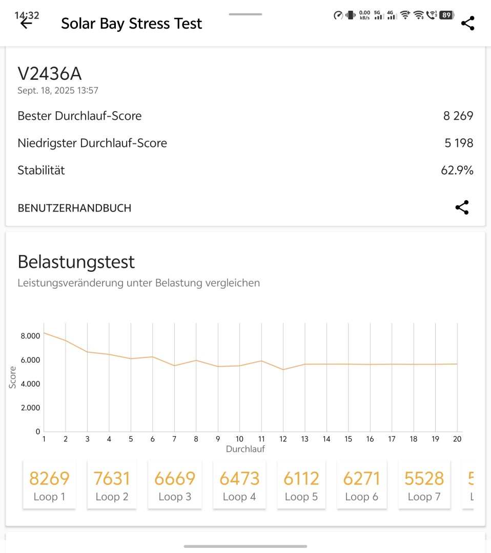 Das Vivo X Fold 5 setzt auf den Snapdragon 8 Gen 3, den Vorgängerchip des Snapdragon 8 Elite. Nach heutigem Leistungsmaßstab siedelt er sich in der gehobenen Mittelklasse an. In den Benchmarks erreicht das Gerät rund 2,2 Millionen Punkte im Antutu, 2233 Punkte im Geekbench CPU Single Core Test und 6539 Punkte im Multi Core Test. Der Geekbench OpenCL Compute Test attestiert der GPU 14349 Punkte, im GFXBench 1140p Aztec Ruins High Tier Benchmark sind es 67 fps. Damit bietet das X Fold 5 bzw. der Snapdragon 8 Gen 3 auch heute noch eine recht gute Leistung, wenngleich nicht mehr auf Oberklasse-Niveau.