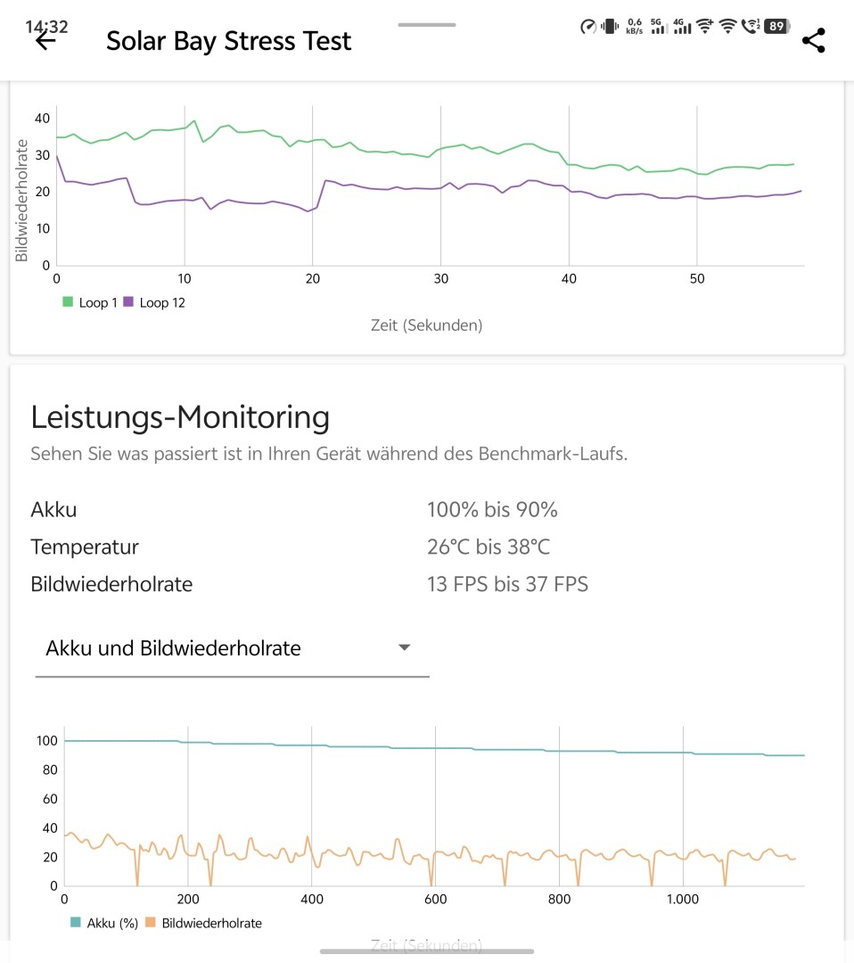 Die Alltagsperformance zeigt sich flüssig, auch beim Wechsel zwischen vielen Apps oder im Chrome Browser mit mehreren offenen Tabs. Das Scrollen durch große Webseiten und lange Social Media Feeds läuft flüssig ab. Nur selten treten mal kleinere Ruckler bei frisch gestarteten Apps oder Nachladen vieler Inhalte auf, längere "Denkpausen" gibt es nie. Auch Spiele laufen noch gut - Genshin Impact mit höchsten Einstellungen recht flüssig auf 50 bis 60 fps.